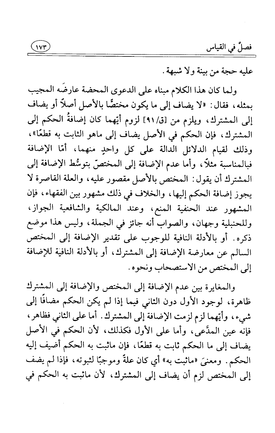 ولما كان هذا الكلام مبناه على الدعوى المحضة عارضَه المجيب بمثله فقال لا يضاف إلى ما يكون مختصًّا بالأصل أصلاً أو يضاف إلى المشترك ويلزم من لزوم أيّهما كان إضافةُ الحكم إلى المشترك فإن الحكم في الأصل يضاف إلى ما هو الثابت به قطعًا وذلك لقيام الدلائل الدالة على كل واحدٍ منهما أمّا الإضافة فبالمناسبة مثلاً وأما عدم الإضافة إلى المختصّ بتوسُّط الإضافة إلى المشترك أن يقول المختص بالأصل مقصور عليه والعلة القاصرة لا يجوز إضافة الحكم إليها والخلاف في ذلك مشهور بين الفقهاء فإن المشهور عند الحنفية المنع وعند المالكية والشافعية الجواز وللحنبلية وجهان والصواب أنه جائز في الجملة وليس هذا موضع ذكره أو بالأدلة النافية للوجوب على تقدير الإضافة إلى المختص السالم عن معارضة الإضافة إلى المشترك أو بالأدلة النافية للإضافة إلى المختص من الاستصحاب ونحوه