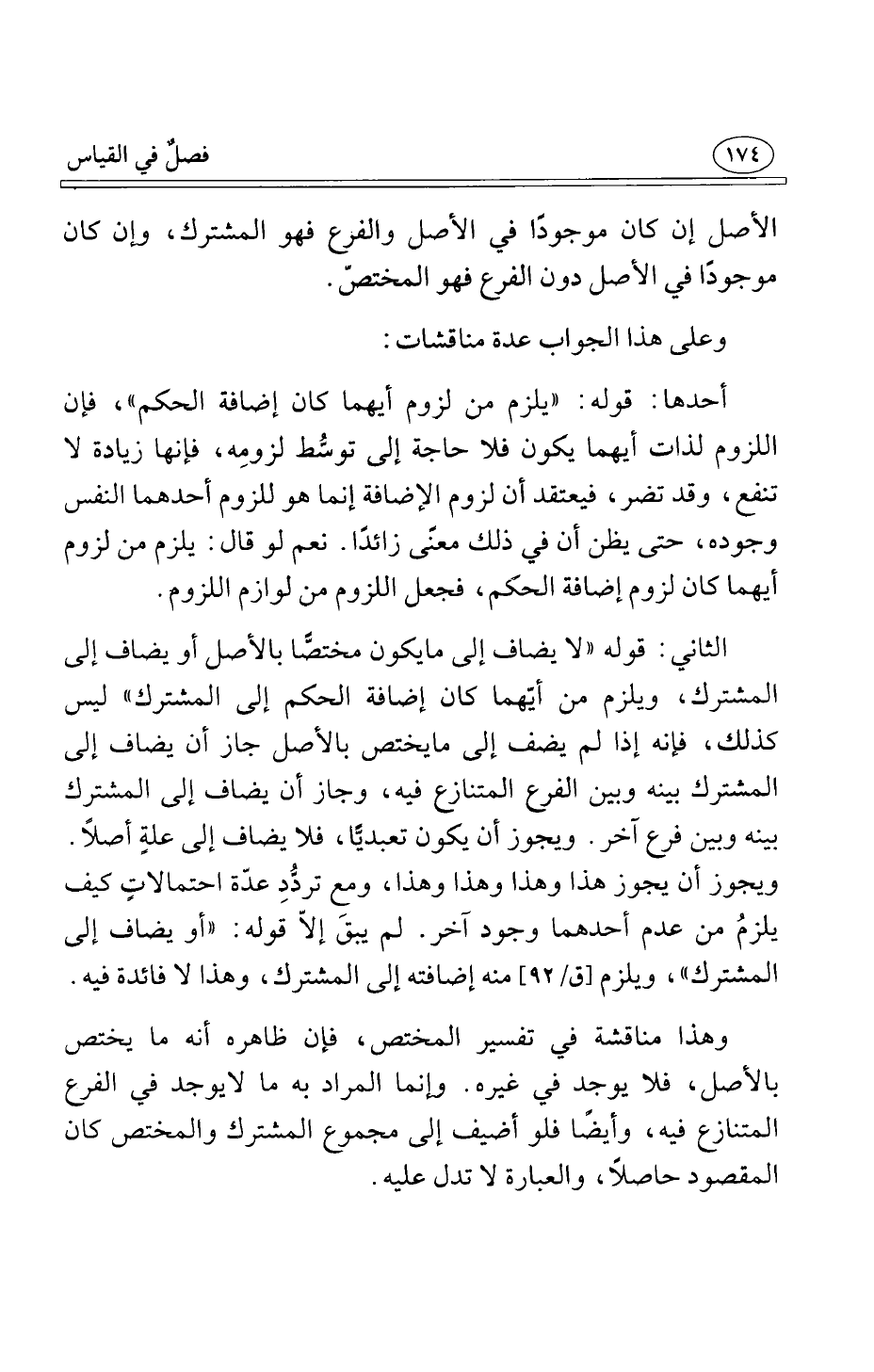 الثاني قوله لا يضاف إلى ما يكون مختصًّا بالأصل أو يضاف إلى المشترك ويلزم من أيّهما كان إضافة الحكم إلى المشترك ليس كذلك فإنه إذا لم يضف إلى ما يختص بالأصل جاز أن يضاف إلى المشترك بينه وبين الفرع المتنازع فيه وجاز أن يضاف إلى المشترك بينه وبين فرع آخر ويجوز أن يكون تعبديًّا فلا يضاف إلى علةٍ أصلاً ويجوز أن يجوز هذا وهذا وهذا وهذا ومع تردُّدِ عدّة احتمالاتٍ كيف يلزمُ من عدم أحدهما وجود آخر لم يبقَ إلاّ قوله أو يضاف إلى المشترك ويلزم منه إضافته إلى المشترك وهذا لا فائدة فيه