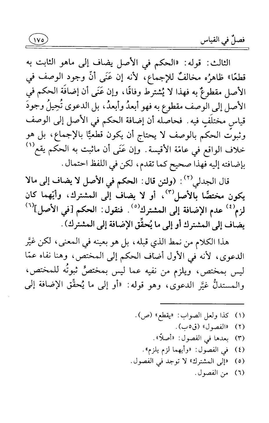 الثالث قوله الحكم في الأصل يضاف إلى ما هو الثابت به قطعًا ظاهرُه مخالفٌ للإجماع لأنه إن عَنَى أنّ وجود الوصف في الأصل مقطوعٌ به فهذا لا يُشترط وفاقًا وإن عَنَى أن إضافَة الحكم في الأصل إلى الوصف مقطوع به فهو أبعدُ وأبعدُ بل الدعوى تُحِيلُ وجودَ قياسٍ مختلَفٍ فيه فحاصله أن إضافة الحكم في الأصل إلى الوصف وثبوت الحكم بالوصف لا يحتاج أن يكون قطعيًّا بالإجماع بل هو خلاف الواقع في عامّة الأقيسة وإن عَنَى أن ما ثبت به الحكم يقع بإضافته إليه فهذا صحيح كما تقدم لكن في اللفظ احتمال