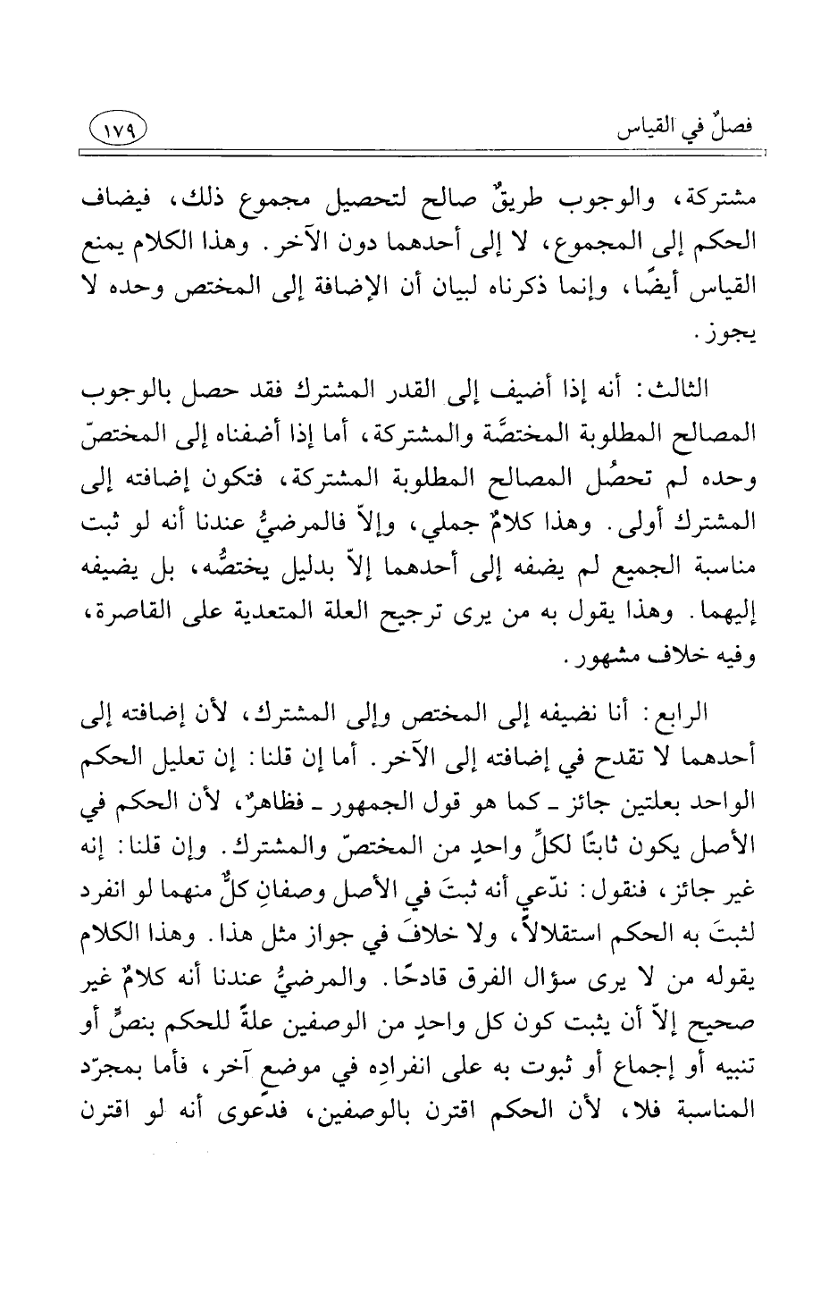 مشتركة والوجوب طريقٌ صالح لتحصيل مجموع ذلك فيضاف الحكم إلى المجموع لا إلى أحدهما دون الآخر وهذا الكلام يمنع القياس أيضًا وإنما ذكرناه لبيان أن الإضافة إلى المختص وحده لا يجوز