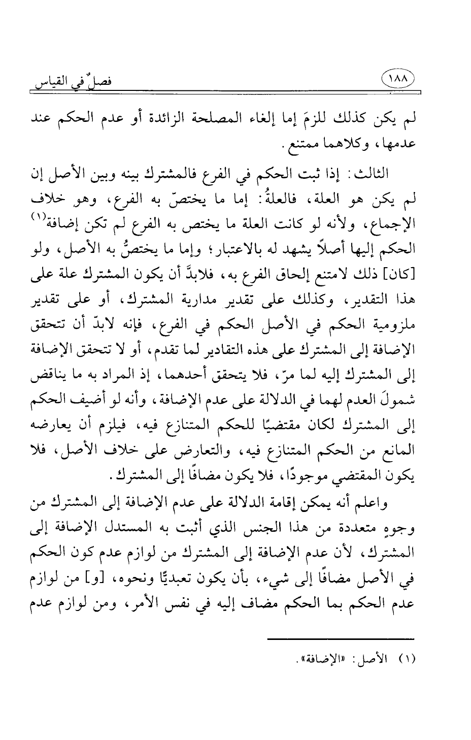 الثالث إذا ثبت الحكم في الفرع فالمشترك بينه وبين الأصل إن لم يكن هو العلة فالعلةُ إما ما يختصّ به الفرع وهو خلاف الإجماع ولنه لو كانت العلة ما يختص به الفرع لم تكن إضافة الحكم إليها أصلاً يشهد له بالاعتبار وإما ما يختصُّ به الأصل ولو كان ذلك لامتنع إلحاق الفرع به فلابدَّ أن يكون المشترك علة على هذا التقدير وكذلك على تقدير مدارية المشترك أو على تقدير ملزومية الحكم في الأصل الحكم في الفرع فإنه لابدّ أن تتحقق الإضافة إلى المشترك على هذه التقادير لما تقدم أو لا تحقق الإضافة إلى المشترك إليه لما مرّ فلا يتحقق أحدهما إذ المراد به ما يناقض شمولَ العدم لهما في الدلالة على عدم الإضافة وأنه لو أضيف الحكم إلى المشترك لكان مقتضيًا للحكم المتنازع فيه فيلزم أن يعارضه المانع من الحكم المتنازع فيه والتعارض على خلاف الأصل فلا يكون المقتضي موجودًا فلا يكون مضافًا إلى المشترك