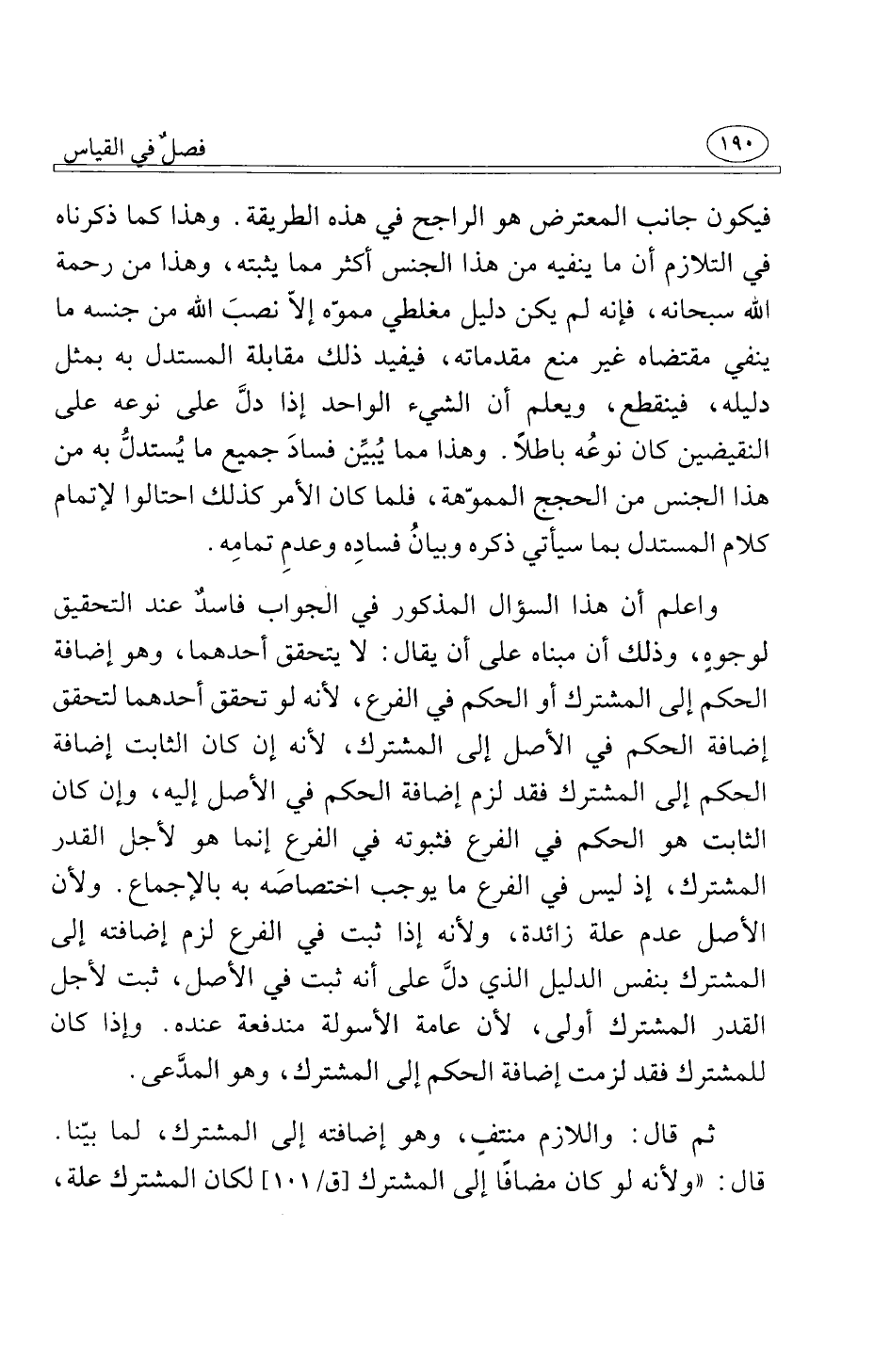 واعلم أن هذا السؤال المذكور في الجواب فاسدٌ عند التحقيق لوجوهٍ وذلك أن مبناه على أن يقال لا يتحقق أحدهما وهو إضافة الحكم إلى المشترك أو الحكم في الفرع لأنه لو تحقق أحدهما لتحقق إضافة الحكم في الأصل المشترك لأنه إن كان الثابت إضافة الحكم إلى المشترك فقد لزم إضافة الحكم في الأصل إليه وإن كان الثابت هو الحكم في الفرع فثبوته في الفرع إنما هو لأجل القدر المشترك إذ ليس في الفرع ما يوجب اختصاصَه به بالإجماع ولأن الأصل عدم علة زائدة ولأنه إذا ثبت في الفرع لزم إضافته إلى المشترك بنفس الدليل الذي دلَّ على أنه ثبت في الأصل ثبت لأجل القدر المشترك أولى لأن عامة الأسولة مندفعة عنده وإذا كان للمشترك فقد لزمت إضافة الحكم إلى المشترك وهو المدَّعى