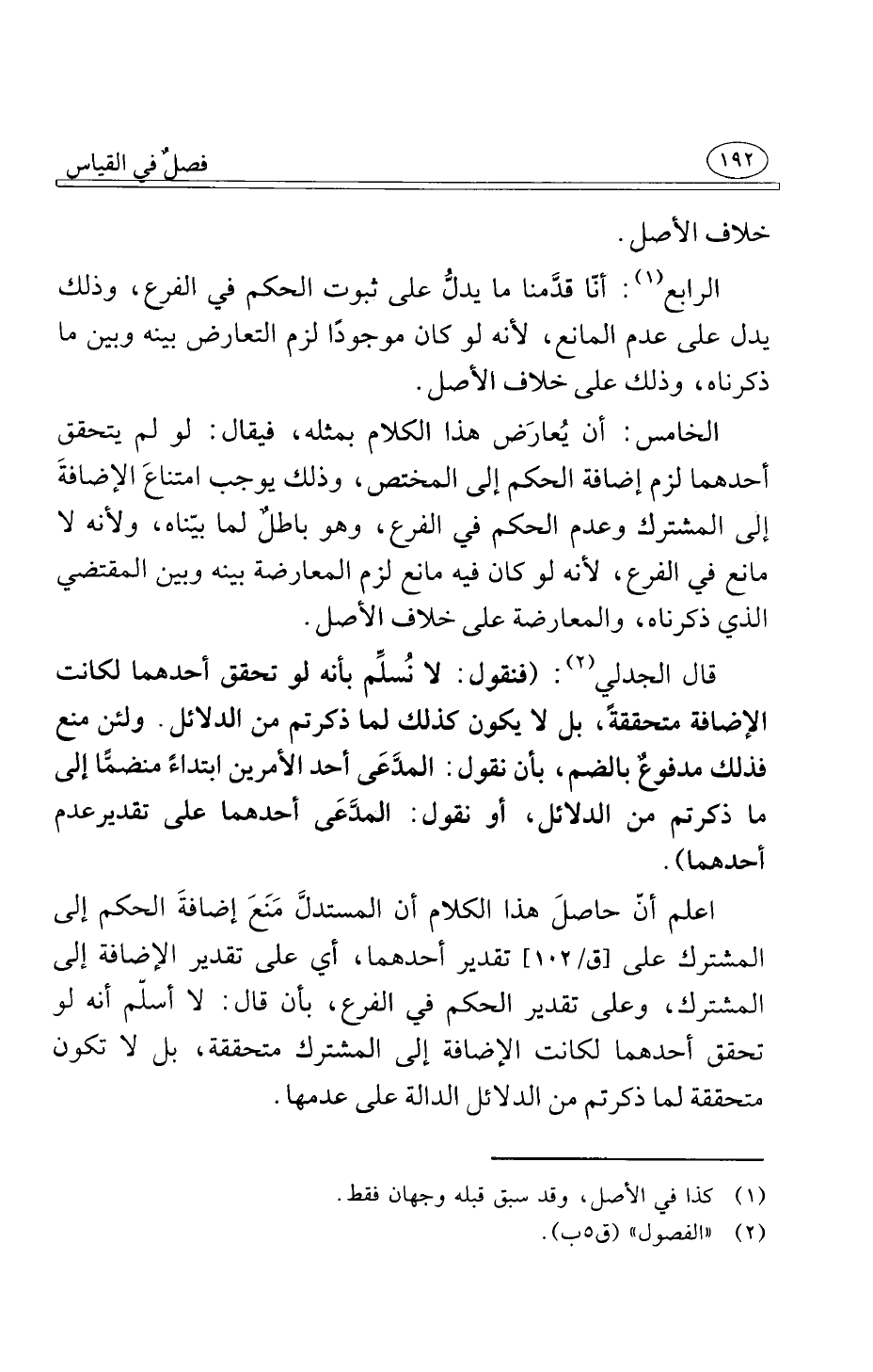 الخامس أن يُعارَض هذا الكلام بمثله فيقال لو لم يتحقق أحدهما لزم إضافة الحكم إلى المختص وذلك يوجب امتناعَ الإضافةَ إلى المشترك وعدم الحكم في الفرع وهو باطلٌ لما بيّناه ولنه لا مانع في الفرع لأنه لو كان فيه مانع لزم المعارضة بينه وبين المقتضي الذي ذكرناه والمعارضة على خلاف الأصل