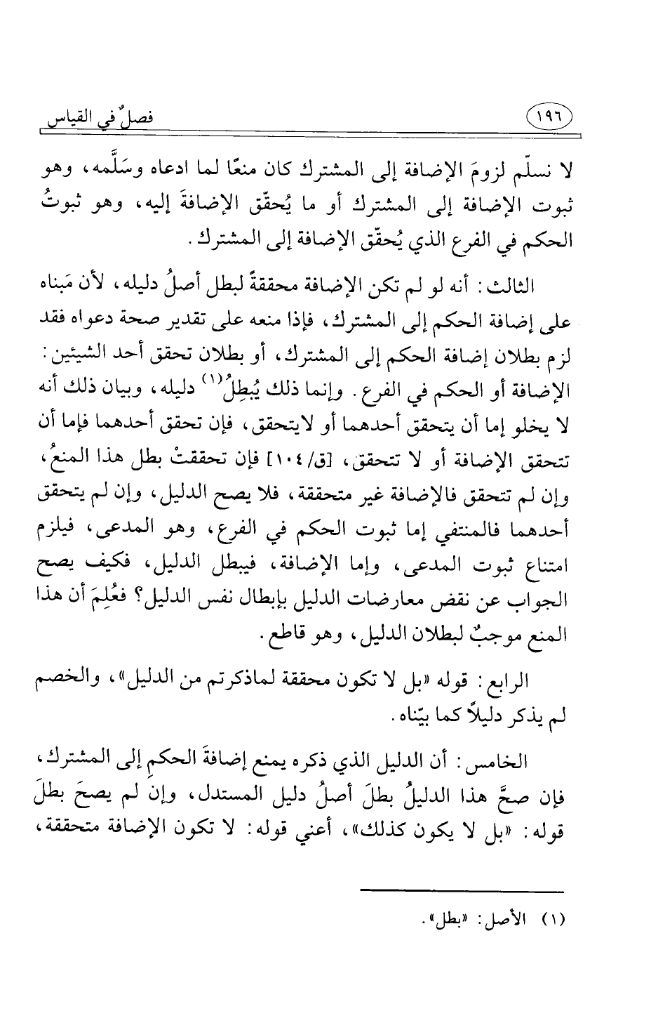 الخامس أن الدليل الذي ذكره يمنع إضافةَ الحكمِ إلى المشترك فإن صحَّ هذا الدليلُ بطلَ أصلُ دليل المستدل وإن لم يصحَ بطلَ قوله بل لا يكون كذلك أعني قوله لا تكون الإضافة متحققة
