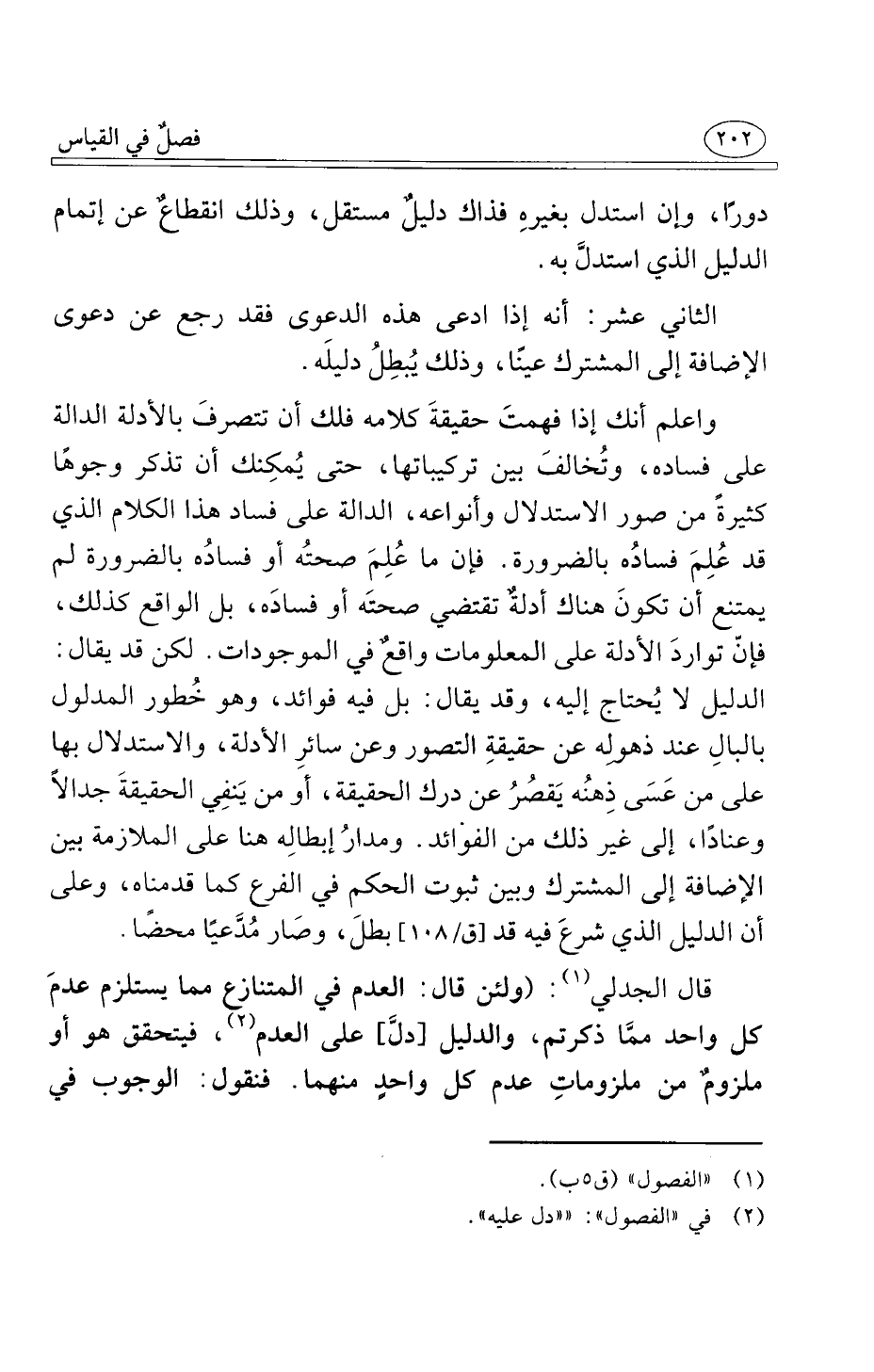 واعلم أنك إذا فهمتَ حقيقةَ كلامه فلك أن تتصرفَ بالأدلة الدالة على فساده وتُخالفَ بين تركيباتها حتى يُمكِنك أن تذكر وجوهًا كثيرةً من صور الاستدلال وأنواعه الدالة على فساد هذا الكلام الذي قد عُلِمَ فسادُه بالضرورة فإن ما عُلِمَ صحتُه أو فسادُه بالضرورة لم يمتنع أن تكونَ هناك أدلةٌ تقتضي صحتَه أو فسادَه بل الواقع كذلك فإنّ تواردَ الأدلة على المعلومات واقعٌ في الموجودات لكن قد يقال الدليل لا يُحتاج إليه وقد يقال بل فيه فوائد وهو خُطور المدلول بالبالِ عند ذهولِه عن حقيقةِ التصور وعن سائرِ الأدلة والاستدلال بها على من عَسَى ذِهنُه يَقصُرُ عن درك الحقيقة أو من يَنفِي الحقيقةَ جدالاً وعنادًا إلى غير ذلك من الفوائد ومدارُ إبطالِه هنا على الملازمة بين الإضافة إلى المشترك وبين ثبوت الحكم في الفرع كما قدمناه وعلى أن الدليل الذي شرعَ فيه قد بطلَ وصَار مُدَّعيًا محضًا