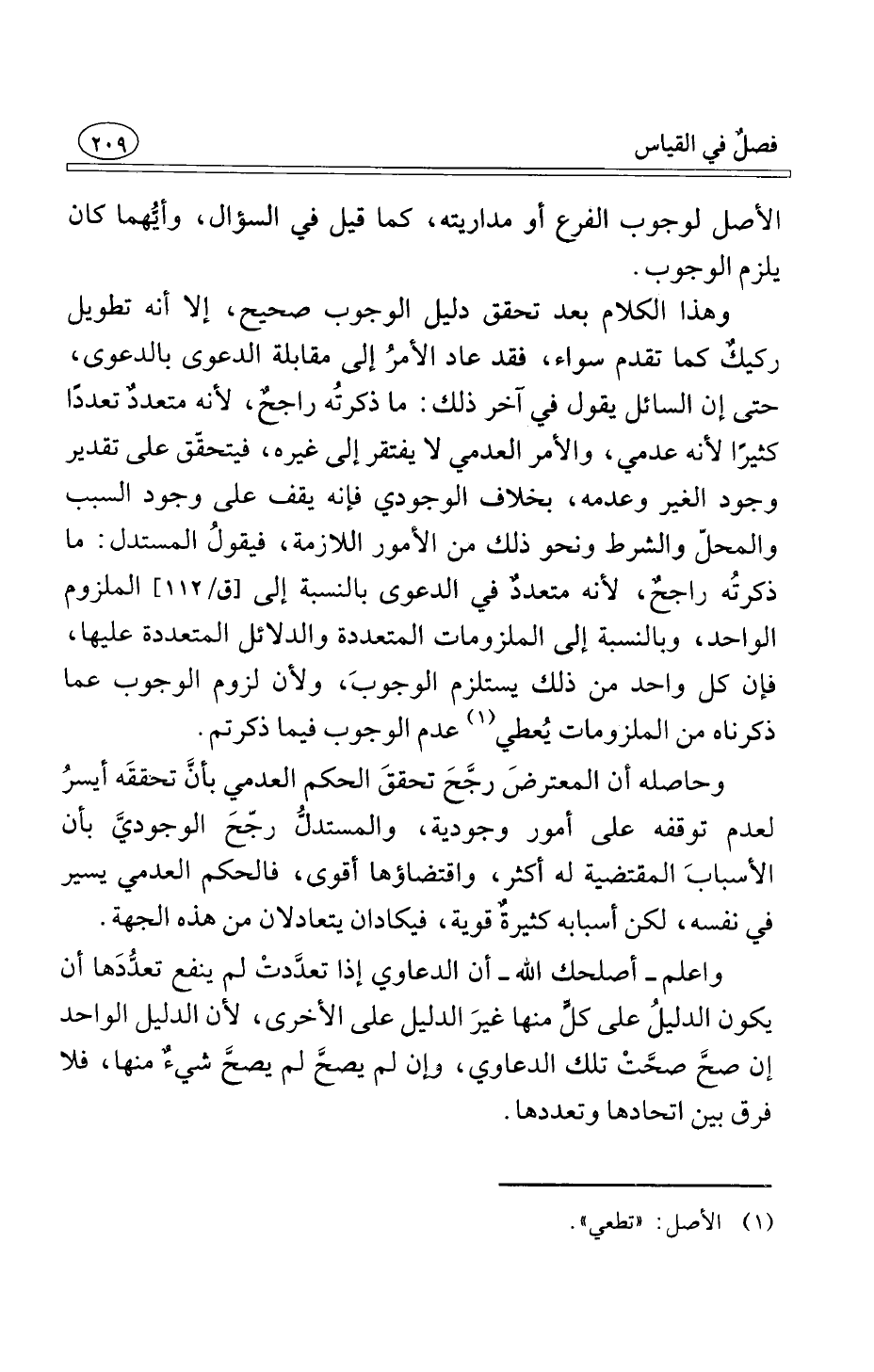 وهذا الكلام بعد تحقق دليل الوجوب صحيح إلا أنه تطويل ركيكٌ كما تقدم سواء فقد عاد الأمر إلى مقابلة الدعوى بالدعوى حتى إن السائل يقول في آخر ذلك ما ذكرتُه راجحٌ لأنه متعددٌ تعددًا كثيرًا لأنه عدمي والأمر العدمي لا يفتقر إلى غيره فيتحقّق على تقدير وجود الغير وعدمه بخلاف الوجودي فإنه يقف على وجود السبب والمحلّ والشرط ونحو ذلك من الأمور اللازمة فيقولُ المستدل ما ذكرتُه راجحٌ لأنه متعددٌ في الدعوى بالنسبة إلى الملزوم الواحد وبالنسبة إلى الملزومات المتعددة والدلائل المتعددة عليها فإن كل واحد من ذلك يستلزم الوجوبَ ولأن لزوم الوجوب عما ذكرناه من الملزومات يُعطي عدم الوجوب فيما ذكرتم