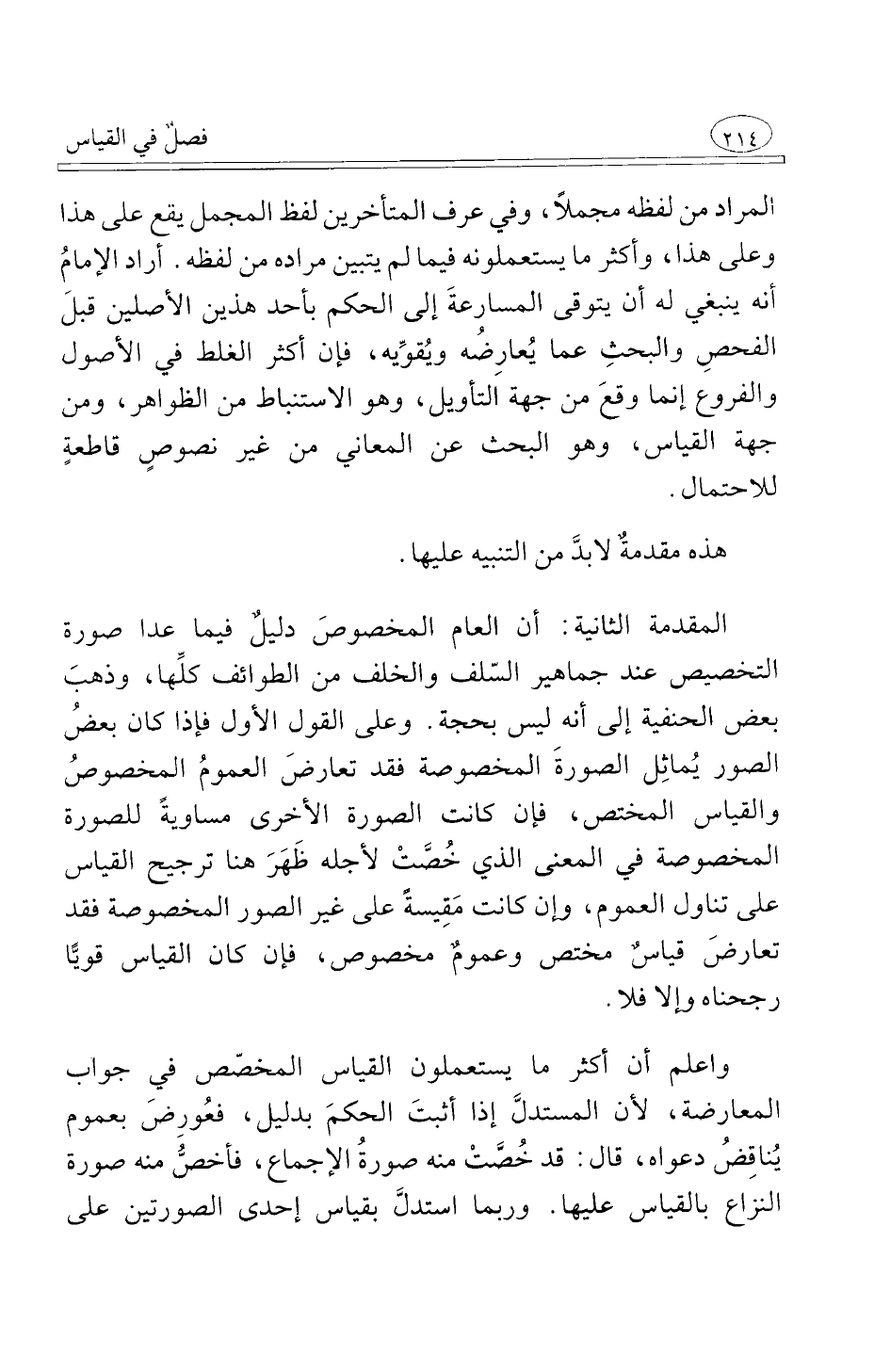 المقدمة الثانية أن العام المخصوصَ دليلٌ فيما عدا صورة التخصيص عند جماهير السّلف والخلف من الطوائف كلِّها وذهبَ بعض الحنفية إلى أنه ليس بحجة وعلى القول الأول فإذا كان بعضُ الصور يُماثِل الصورةَ المخصوصة فقد تعارضَ العمومُ المخصوصُ والقياس المختص فإن كانت الصورة الأخرى مساويةً للصورة المخصوصة في المعنى الذي خُصَّتْ لأجله ظَهَرَ هنا ترجيح القياس على تناول العموم وإن كانت مَقِيسةً على غير الصور المخصوصة فقد تعارضَ قياسٌ مختص وعمومٌ مخصوص فإن كان القياس قويًّا رجحناه وإلا فلا