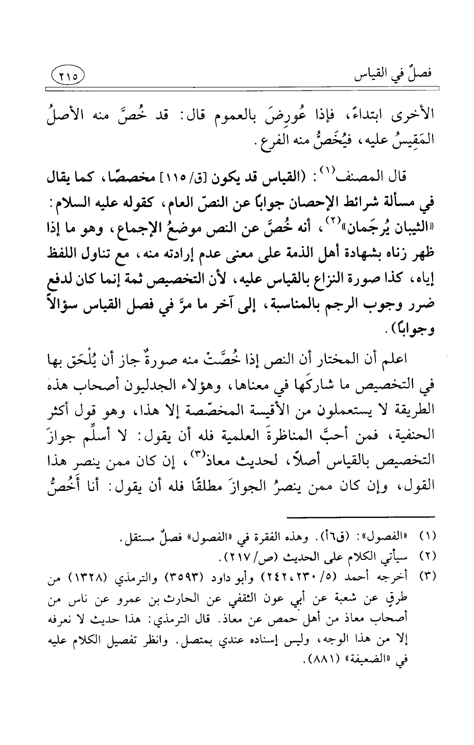 اعلم أن المختار أن النص إذا خُصَّتْ منه صورةٌ جاز أن يُلْحَق بها في التخصيص ما شاركَها في معناها وهؤلاء الجدليون أصحاب هذه الطريقة لا يستعملون من الأقيسة المخصّصة إلا هذا وهو قول أكثر الحنفية فمن أحبَّ المناظرةَ العلمية فله أن يقول لا أسلِّم جوازَ التخصيص بالقياس أصلاً لحديث معاذ إن كان ممن ينصر هذا القول وإن كان ممن ينصرُ الجوازَ مطلقًا فله أن يقول أنا أَخُصُّ