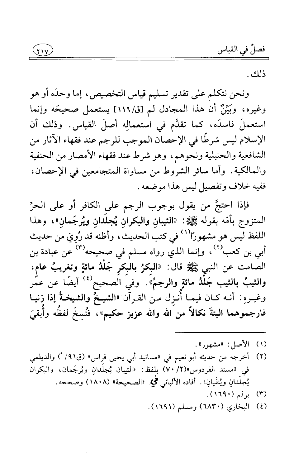 ونحن نتكلم على تقدير تسليم قياس التخصيص إما وحدَه أو هو وغيره وبَيِّنٌ أن هذا المجادل لم يستعمل صحيحَه وإنما استعملَ فاسدَه كما تقدَّم في استعمالِه أصلَ القياس وذلك أن الإسلام ليس شرطًا في الإحصان الموجب للرجم عند فقهاء الآثار من الشافعية والحنبلية ونحوهم وهو شرط عند فقهاء الأمصار من الحنفية والمالكية وأما سائر الشروط من مساواة المتجامعين في الإحصان ففيه خلاف وتفصيل ليس هذا موضعه