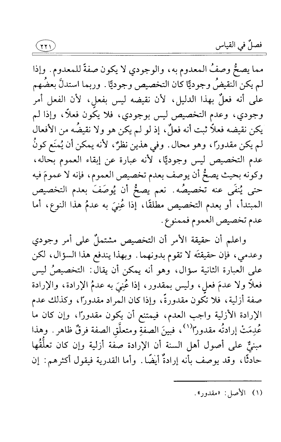 مما يصحُّ وصفُ المعدوم به والوجودي لا يكون صفةً للمعدوم وإذا لم يكن النقيضُ وجوديًّا كان التخصيص وجوديًّا وربما استدلَّ بعضُهم على أنه فعلٌ بهذا الدليل لأن نقيضه ليس بفعلٍ لأن الفعل أمر وجودي وعدم التخصيص ليس بوجودي فلا يكون فعلاً وإذا لم يكن نقيضه فعلاً ثبت أنه فعلٌ إذ لو لم يكن هو ولا نقيضُه من الأفعال لم يكن مقدورًا وهو محال وفي هذين نظرٌ لأنه يمكن أن يُمنَع كونُ عدم التخصيص ليس وجوديًّا لأنه عبارة عن إبقاء العموم بحاله وكونه بحيث يصحُّ أن يوصف بعدم تخصيص العموم فإنه لا عمومَ فيه حتى يُنفَى عنه تخصيصُه نعم يصحُّ أن يُوصَفَ بعدم التخصيص المبتدأ أو بعدم التخصيص مطلقًا إذا عُنِيَ به عدمُ هذا النوع أما عدم تخصيص العموم فممنوع