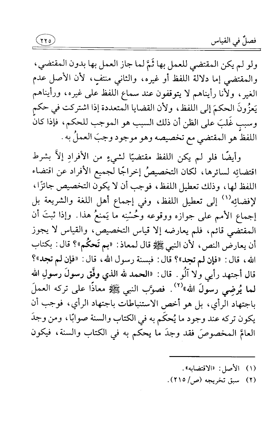 وأيضًا فل لم يكن اللفظ مقتضيًا لشيءٍ من الأفرادِ إلاَّ بشرط اقتضائِه لسائرها لكان التخصيص إخراجًا لجميع الأفراد عن اقتضاء اللفظ لها وذلك تعطيل اللفظ فوجب أن لا يكون التخصيص جائزًا لإفضائِه إلى تعطيل اللفظ وفي إجماع أهل اللغة والشريعة يل إجماع الأمم على جوازه ووقوعه وحُسْنِه ما يَمنعُ هذا وإذا ثبتَ أن المقتضي قائم فلم يعارضه إلا قياس التخصيص والقياس لا يجوز أن يعارض النص لأن النبي صلى الله عليه وسلم قال لمعاذ بم تَحكُم قال بكتاب الله قال فإن لم تجد قال فبسنة رسول الله قال فإن لم تجد قال أجتهد رأيي ولا آلُو قال الحمد لله الذي وفَّق رسولَ رسلِ الله لما يُرضِي رسولَ الله فصوَّب النبي صلى الله عليه وسلم معاذًا على تركه العملَ باجتهاد الرأي بل هو أخص الاستنباطات باجتهاد الرأي فوجب أن يكون تركه عند وجود ما يُحكَم به في الكتاب والسنة صوابًا ومن وجدَ العامَّ المخصوصَ فقد وجدَ ما يحكم به في الكتاب والسنة فيكون