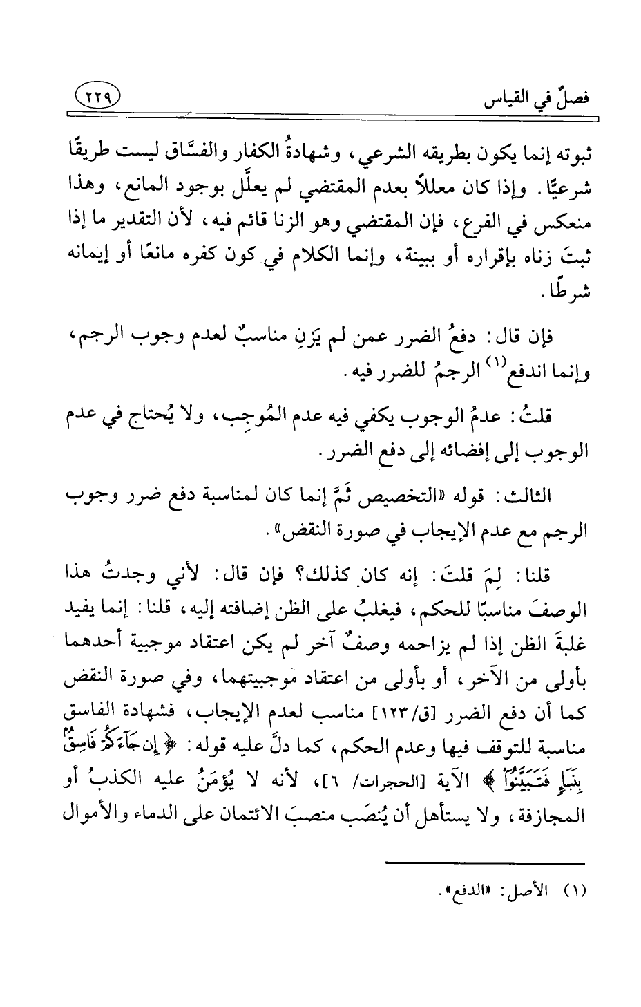 قلنا لِمَ قلتَ إنه كان كذلك فإن قال لأني وجدتُ هذا الوصفَ مناسبًا للحكم فيغلبُ على الظن إضافته إليه قلنا إنما يفيد غلبةَ الظن إذا لم يزاحمه وصفٌ آخر لم يكن اعتقاد موجبية أحدهما بأولى من الآخر أو بأولى من اعتقاد موجبيتهما وفي صورة النقض كما أن دفع الضرر مناسب لعدم الإيجاب فشهادة الفاسق مناسبة للتوقف فيها وعدم الحكم كما دلَّ عليه قوله إِنْ جَاءَكُمْ فَاسِقٌ بِنَبَإٍ فَتَبَيَّنُوا الآية [الحجرات 6] لا يُؤمَنُ عليه الكذبُ أو المجازفة ولا يستأهل أن يُنصَب منصبَ الائتمان على الدماء والأموال