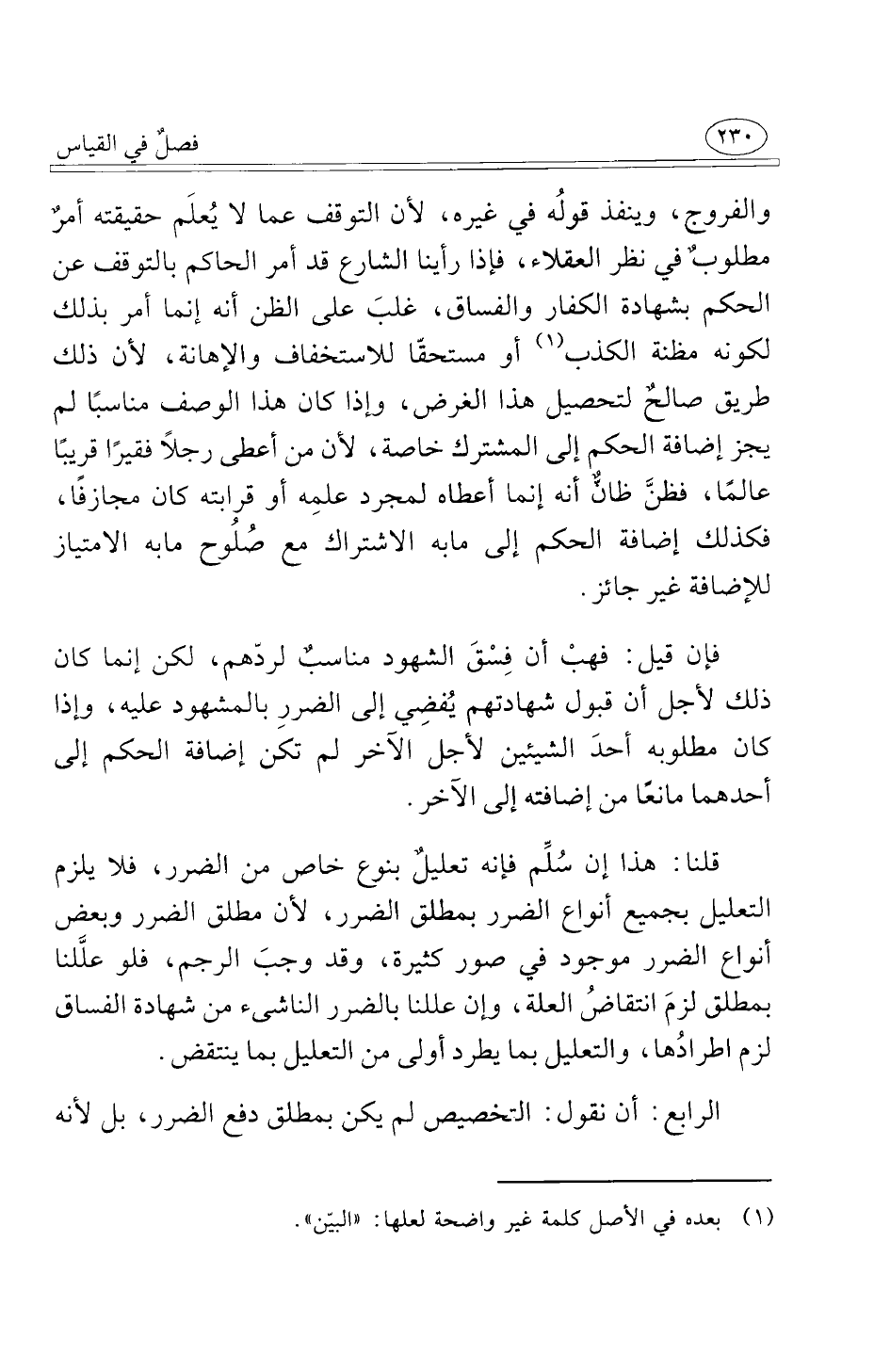قلنا هذا إن سُلِّم فإنه تعليلٌ بنوع خاص من الضرر فلا يلزم التعليل بجميع أنواع الضرر بمطلق الضرر لأن كطلق الضرر وبعض أنواع الضرر موجود في صور كثيرة وقد وجبَ الرجم فلو علَّلنا بمطلق لزمَ انتقاضُ العلة وإن عللنا بالضرر الناشئ من شهادة الفساق لزم اطرادُها والتعليل بما يطرد أولى من التعليل بما ينتقض