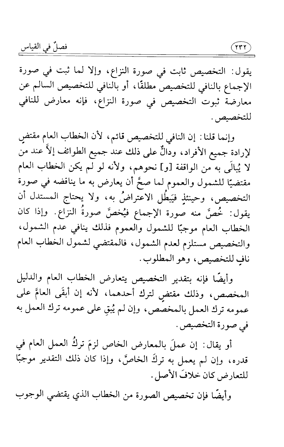 وإنما قلنا إن النافي للتخصيص قائم لأن الخطاب العام مقتضٍ لإرادة جميع الأفراد ودالٌّ على ذلك عند جميع الطوائف إلاَّ عند من لا يُبالَى به من الواقفة و نحوهم ولأنه لو لم يكن الخطاب العام مقتضيًا للشمول والعموم لما صحَّ أن يعارض به ما يناقضه في صورة التخصيص وحينئذٍ فيَبطُل الاعتراضُ به ولا يحتاج المستدل أن يقول خُصَّ منه صورة الإجماع فيُخصَّ صورةُ النزاع وإذا كان الخطاب العام موجبًا للشمول والعموم فذلك ينافي عدم الشمول والتخصيص مستلزم لعدم الشمول فالمقتضي لشمول الخطاب العام نافٍ للتخصيص وهو المطلوب