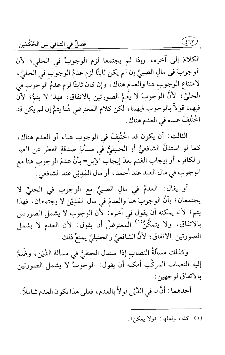أو يقال العدمُ في مالِ الصبيِّ مع الوجوب في الحليِّ لا يجتمعان بأنَّ الوجوبَ هنا والعدمَ في مال المَدِيْن لا يجتمعان فهذا يتم لأنه يمكنه أن يقول في آخره لأن الوجوب لا يشمل الصورتين بالاتفاق ولا يتمكَّنُ المعترضُ أن يقول لأن العدم لا يشمل الصورتين بالاتفاق لأنَّ الشافعيَّ والحنبليَّ يمنعُ ذلك