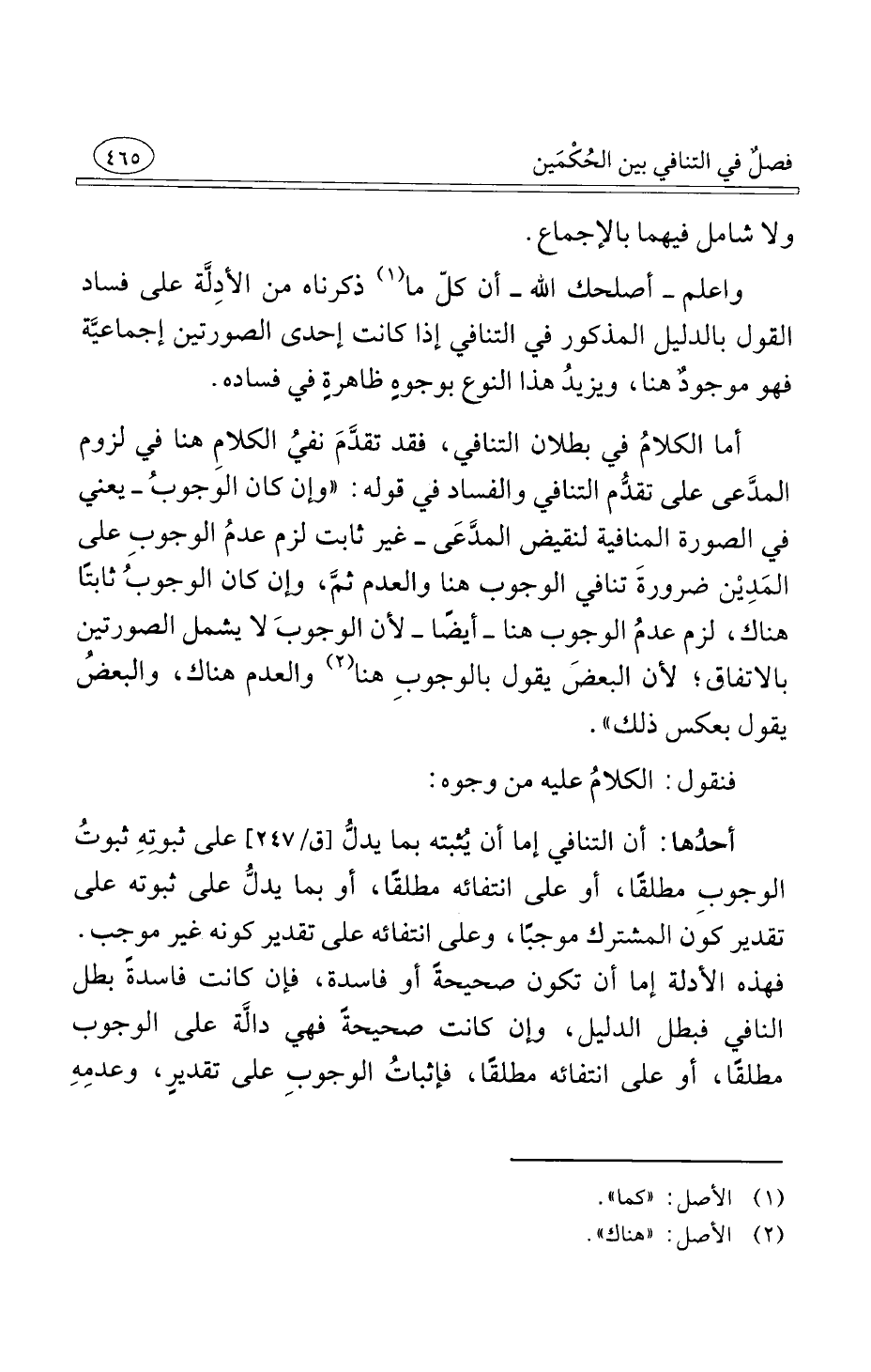 أحدُها أن التنافي إما أن يُثبته بما يدلُّ على ثبوتِهِ ثبوتُ الوجوبِ مطلقًا أو على انتفائه مطلقًا أو بما يدلُّ على ثبوته على تقدير كون المشترك موجبًا وعلى انتفائه على تقدير كونه غير موجب فهذه الأدلة إما أن تكون صحيحةً أو فاسدة فإن كانت فاسدةً بطل النافي فبطل الدليل وإن كانت صحيحةً فهي دالَّة على الوجوب مطلقًا أو على انتفائه مطلقًا فإثباتُ الوجوبِ على تقديرٍ وعدمِهِ