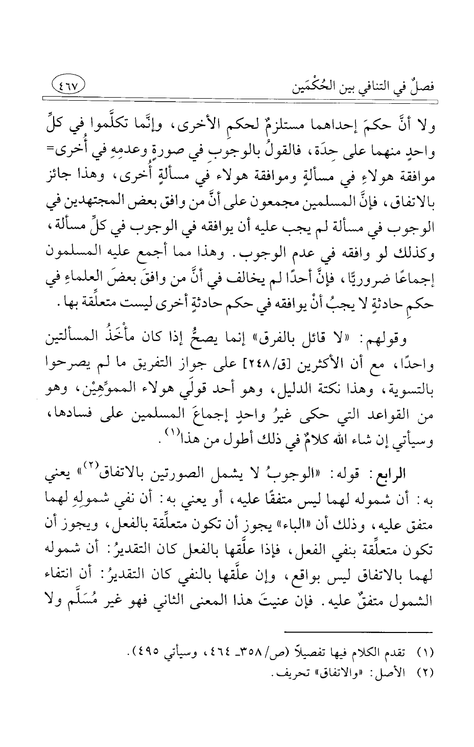 الرابع قوله الوجوبُ لا يشمل الصورتين بالاتفاق يعني به أن شموله لهما ليس متفقًا عليه أو يعني به أن نفي شمولِهِ لهما متفق عليه وذلك أن الباء يجوز أن تكون متعلِّقة بالفعل ويجوز أن تكون متعلِّقة بنفي الفعل فإذا علَّقها بالفعل كان التقديرُ أن شموله لهما بالاتفاق ليس بواقع وإن علَّقها بالنفي كان التقديرُ أن انتفاء الشمول متفقٌ عليه فإن عنيتَ هذا المعنى الثاني فهو غير مُسَلَّم ولا