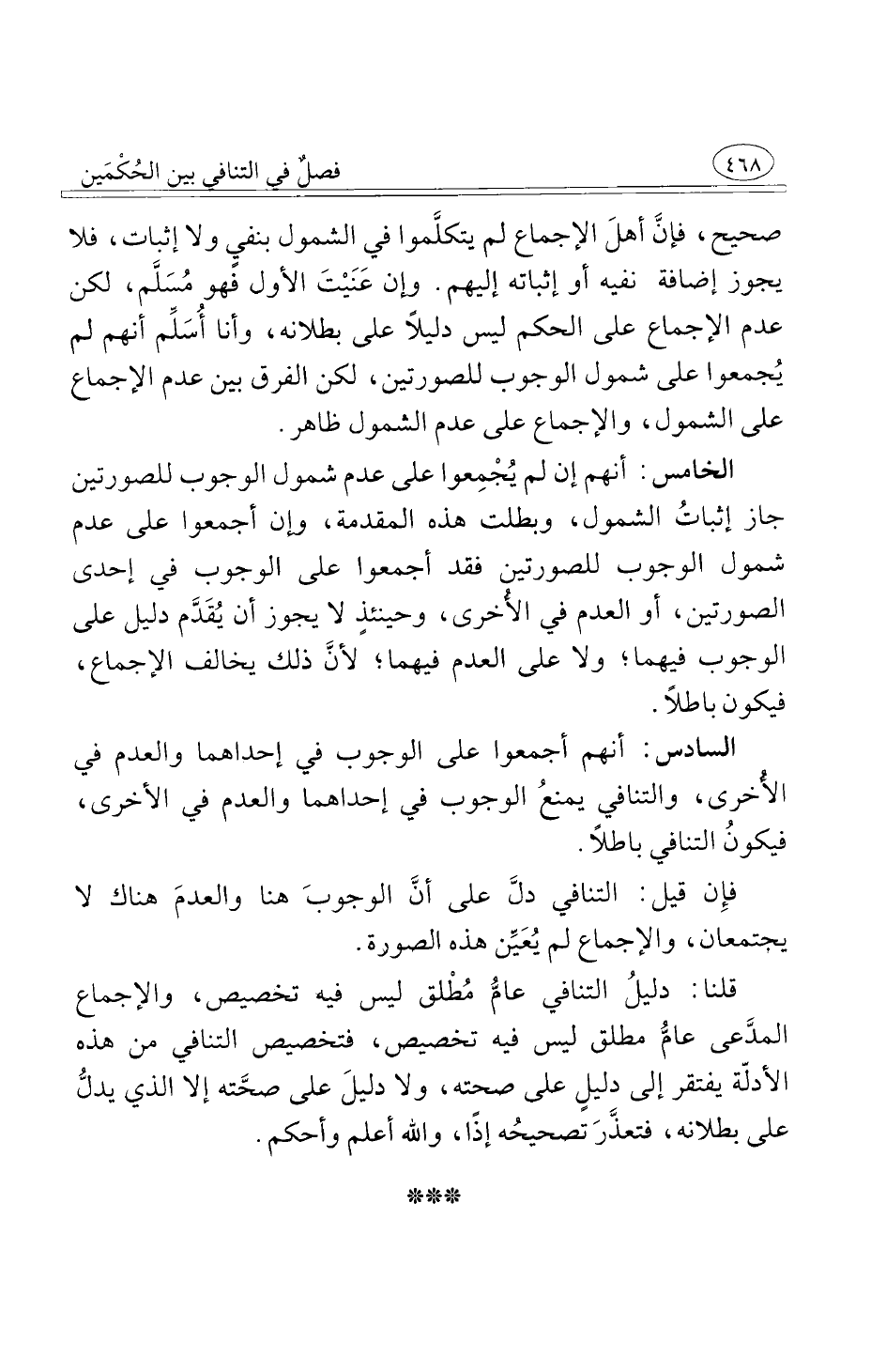 الخامس أنهم إن لم يُجْمِعوا على عدم شمول الوجوب للصورتين جاز إثباتُ الشمول وبطلت هذه المقدمة وإن أجمعوا على عدم شمول الوجوب للصورتين فقد أجمعوا على الوجوب في إحدى الصورتين أو العدم في الأُخرى وحينئذٍ لا يجوز أن يُقَدَّم دليل على الوجوب فيهما ولا على العدم فيهما لأنَّ ذلك يخالف الإجماع فيكون باطلاً