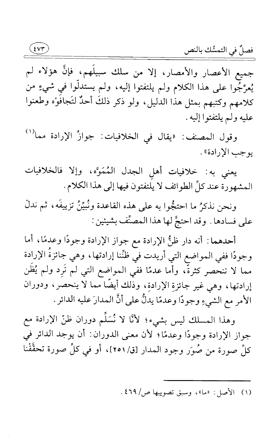 وهذا المسلك ليس بشيء لأنَّا لا نُسَلِّم دوران ظنّ الإرادة مع جواز الإرادة وجودًا وعدمًا لأن معنى الدوران أن يوجد الدائر في كلِّ صورة من صُوَر وجود المدار أو في كلِّ صورة تحقَّقْنا
