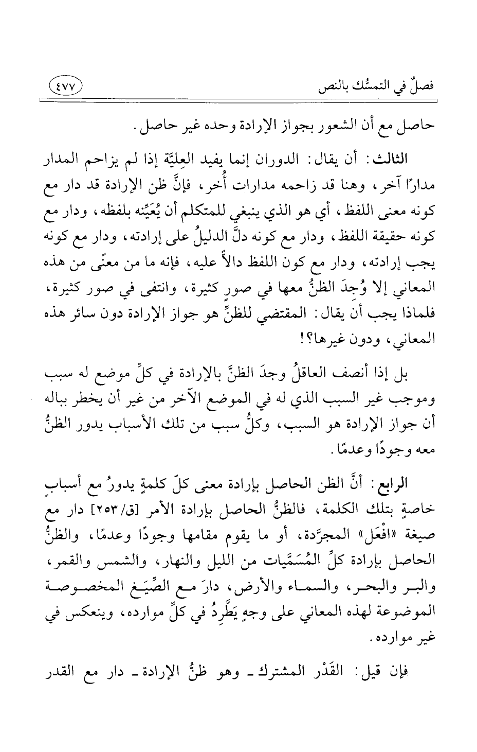 الثالث أن يقال الدوران إنما يفيد العِليَّة إذا لم يزاحم المدار مدارًا آخر وهنا قد زاحمه مدارات أُخر فإنَّ ظن الإرادة قد دار مع كونه معنى اللفظ أي هو الذي ينبغي للمتكلم أن يُعَيِّنه بلفظه ودار مع كونه حقيقة اللفظ ودار مع كونه دلَّ الدليلُ على إرادته ودار مع كونه يجب إرادته ودار مع كون اللفظ دالاً عليه فإنه ما من معنًى من هذه المعاني إلا وُجِدَ الظنُّ معها في صورٍ كثيرة وانتفي في صور كثيرة فلماذا يجب أن يقال المقتضي للظنِّ هو جواز الإرادة دون سائر هذه المعاني ودون غيرها