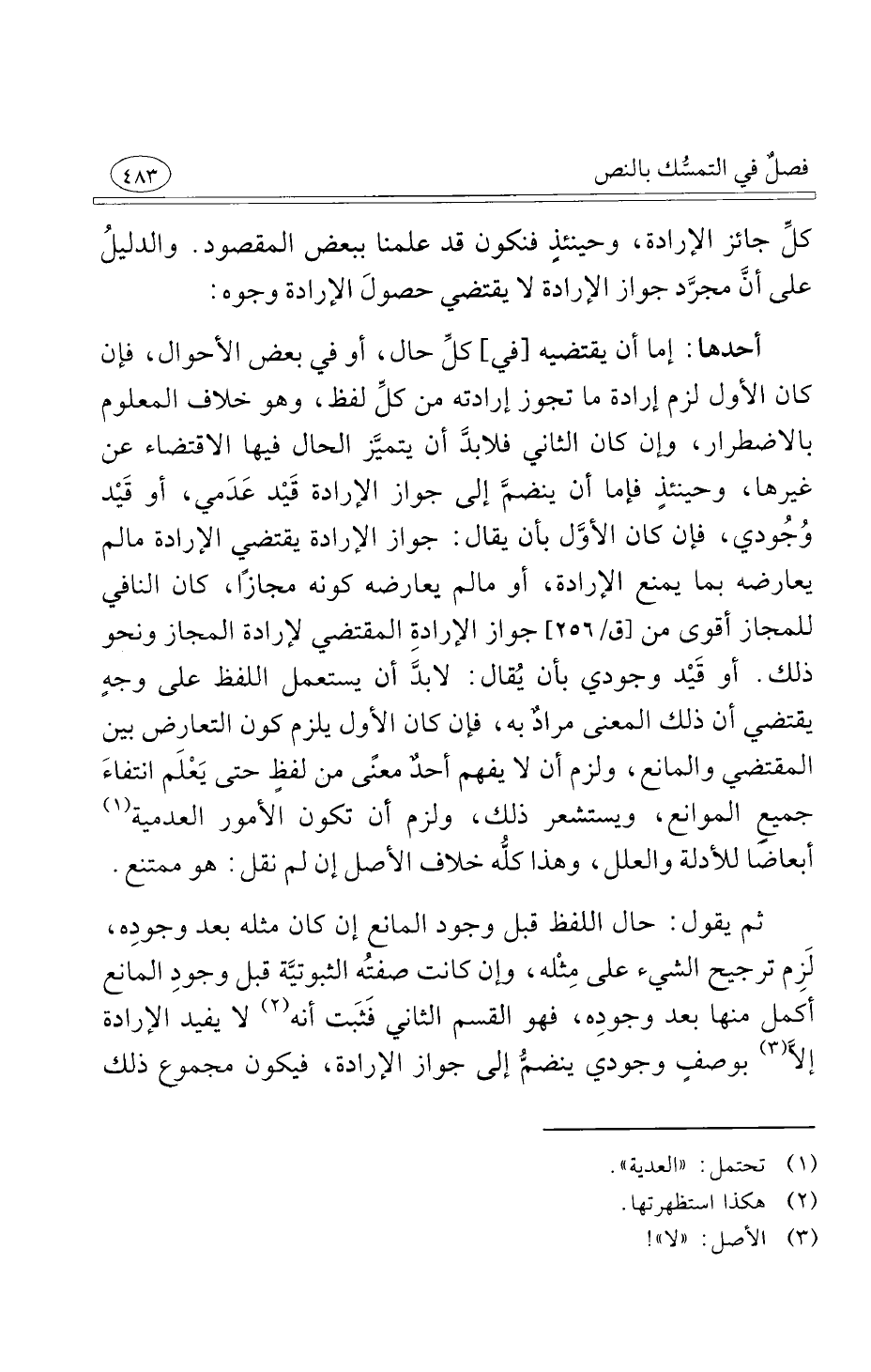 أحدها إما أن يقتضيه في كلِّ حال أو في بعض الأحوال فإن كان الأول لزم إرادة ما تجوز إرادته من كلِّ لفظ وهو خلاف المعلوم بالاضطرار وإن كان الثاني فلابدَّ أن يتميَّز الحال فيها الاقتضاء عن غيرها وحينئذٍ فإما أن ينضمَّ إلى جواز الإرادة قَيْد عَدَمي أو قَيْد وُجُودي فإن كان الأوَّل بأن يقال جواز الإرادة يقتضي الإرادة ما لم يعارضه بما يمنع الإرادة أو ما لم يعارضه كونه مجازًا كان النافي للمجاز أقوى من جواز الإرادةِ المقتضي لإرادة المجاز ونحو ذلك أو قَيْد وجودي بأن يُقال لابدَّ أن يستعمل اللفظ على وجهٍ يقتضي أن ذلك المعنى مرادٌ به فإن كان الأول يلزم كون التعارض بين المقتضي والمانع ولزم أن لا يفهم أحدٌ معنًى من لفظٍ حتى يَعْلَم انتفاءَ جميعِ الموانع ويستشعر ذلك ولزم أن تكون الأمور العدمية أبعاضًا للأدلة والعلل وهذا كلُّه خلاف الأصل إن لم نقل هو ممتنع