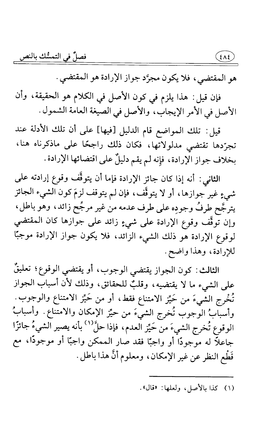 الثالث كون الجواز يقتضي الوجوب أو يقتضي الوقوع تعليقٌ على الشيء ما لا يقتضيه وقلبٌ للحقائق وذلك لأن أسباب الجواز تُخْرج الشيءَ من حَيِّز الامتناع فقط أو من حَيِّز الامتناع والوجوب وأسبابُ الوجوب تُخرج الشيءَ من حيِّز الإمكان والامتناع وأسبابُ الوقوع تُخرج الشيءَ من حَيِّز العدم فإذا حلَّ بأنه يصير الشيءُ جائزًا جاعلاً له موجودًا أو واجبًا فقد صار الممكن واجبًا أو موجودًا مع قَطْع النظر عن غير الإمكان ومعلوم أنَّ هذا باطل