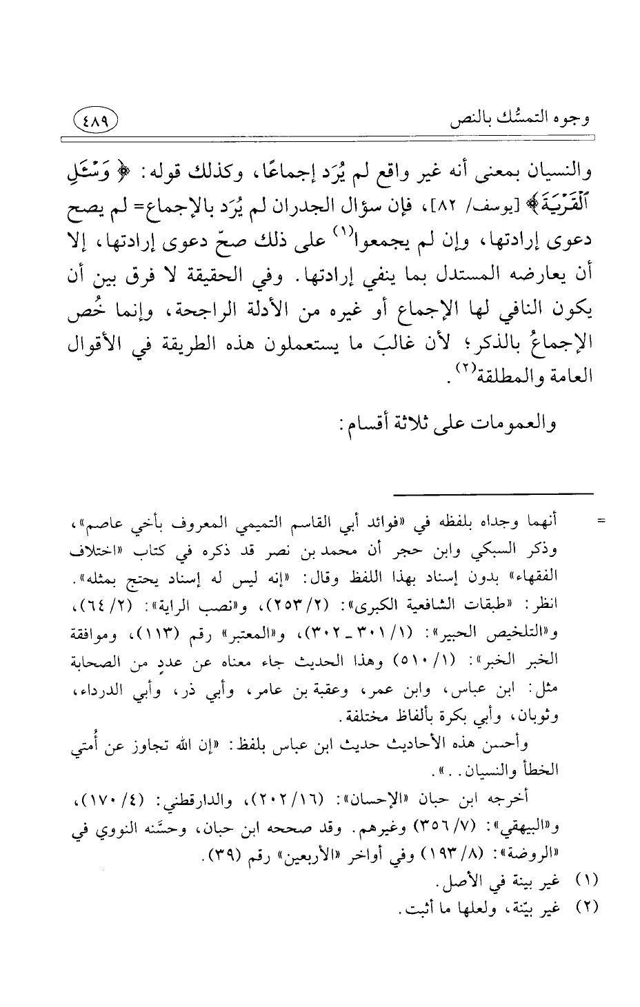 والنسيان بمعنى أنه غير واقع لم يُرَد إجماعًا وكذلك قوله وَاسْأَلِ الْقَرْيَةَ [يوسف 82] فإن سؤال الجدران لم يُرَد بالإجماع لم يصح دعوى إرادتها وإن لم يجمعوا على ذلك صحّ دعوى إرادتها إلا أن يعارض المستدل بما ينفي إرادتها وفي الحقيقة لا فرق بين أن يكون النافي لها الإجماع أو غيره من الأدلة الراجحة وإنما خُص الإجماعُ بالذكر لأن غالبَ ما يستعملون هذه الطريقة في الأقوال العامة والمطلقة