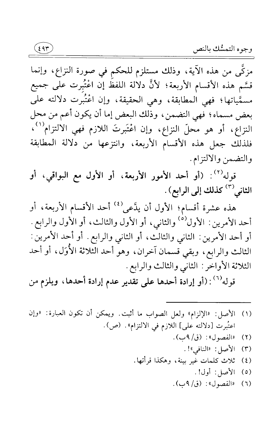 مزَّكى من هذه الآية وذلك مستلزم للحكمِ في صورة النزاع وإنما قسَّم هذه الأقسام الأربعة لأنَّ دلالة اللفظ إن اعْتُبِرت على جميع مسمَّياتها فهي المطابقة وهي الحقيقة وإن اعْتُبِرت دلالته على بعض مسماه فهي التضمن وذلك البعض إما أن يكون أعم من محل النزاع أو هو محلّ النزاع وإن اعْتَبرتَ اللازم فهي الالتزام فلذلك جعل هذه الأقسام الأربعة وانتزعها من دلالة المطابقة والتضمن والالتزام