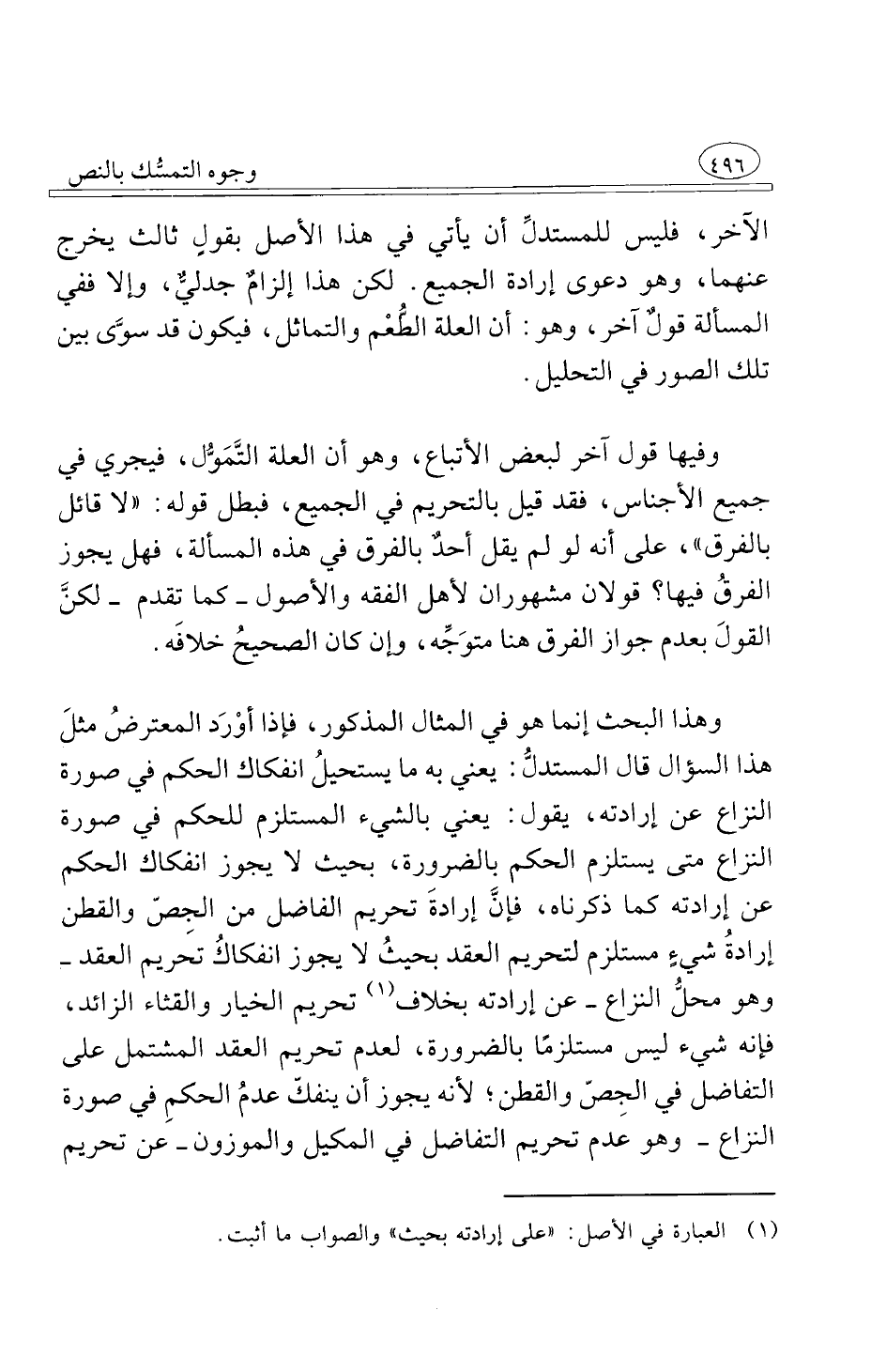 وهذا البحث إنما هو في المثال المذكور فإذا أوْرَد المعترضُ مثلَ هذا السؤال قال المستدلُّ يعني به ما يستحيلُ انفكاك الحكم في صورة النزاع عن إرادته يقول يعني بالشيء المستلزم للحكم في صورة النزاع متى يستلزم الحكم بالضرورة بحيث لا يجوز انفكاك الحكم عن إرادته كما ذكرناه فإنَّ إرادةَ تحريم الفاضل من الجِصّ والقطن إرادةُ شيءٍ مستلزم لتحريم العقد بحيثُ لا يجوز انفكاكُ تحريم العقد وهو محلُّ النزاع عن إرادته بخلاف تحريم الخيار والقثاء الزائد فإنه شيء ليس مستلزمًا بالضرورة لعدم تحريم العقد المشتمل على التفاضل في الجِصّ والقطن لأنه يجوز أن ينفكّ عدمُ الحكمِ في صورة النزاع وهو عدم تحريم التفاضل في المكيل والموزون عن تحريم