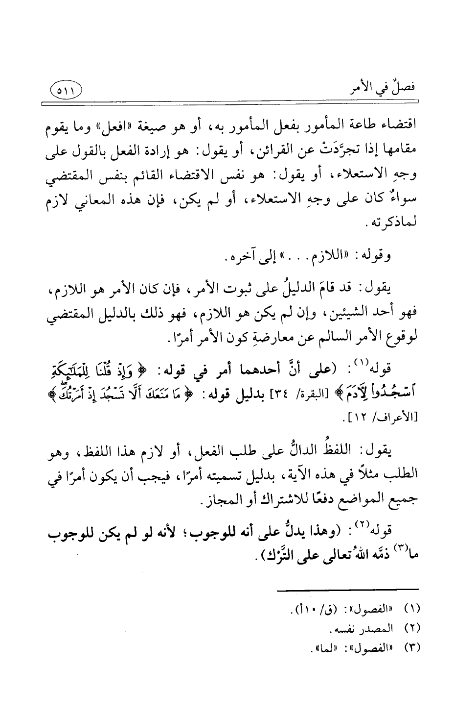 قوله على أنَّ احدهما أمر في قوله وَإِذْ قُلْنَا لِلْمَلَائِكَةِ اسْجُدُوا لِآدَمَ [البقرة 34] بدليل قوله قَالَ مَا مَنَعَكَ أَلَّا تَسْجُدَ إِذْ أَمَرْتُكَ [الأعراف 34]