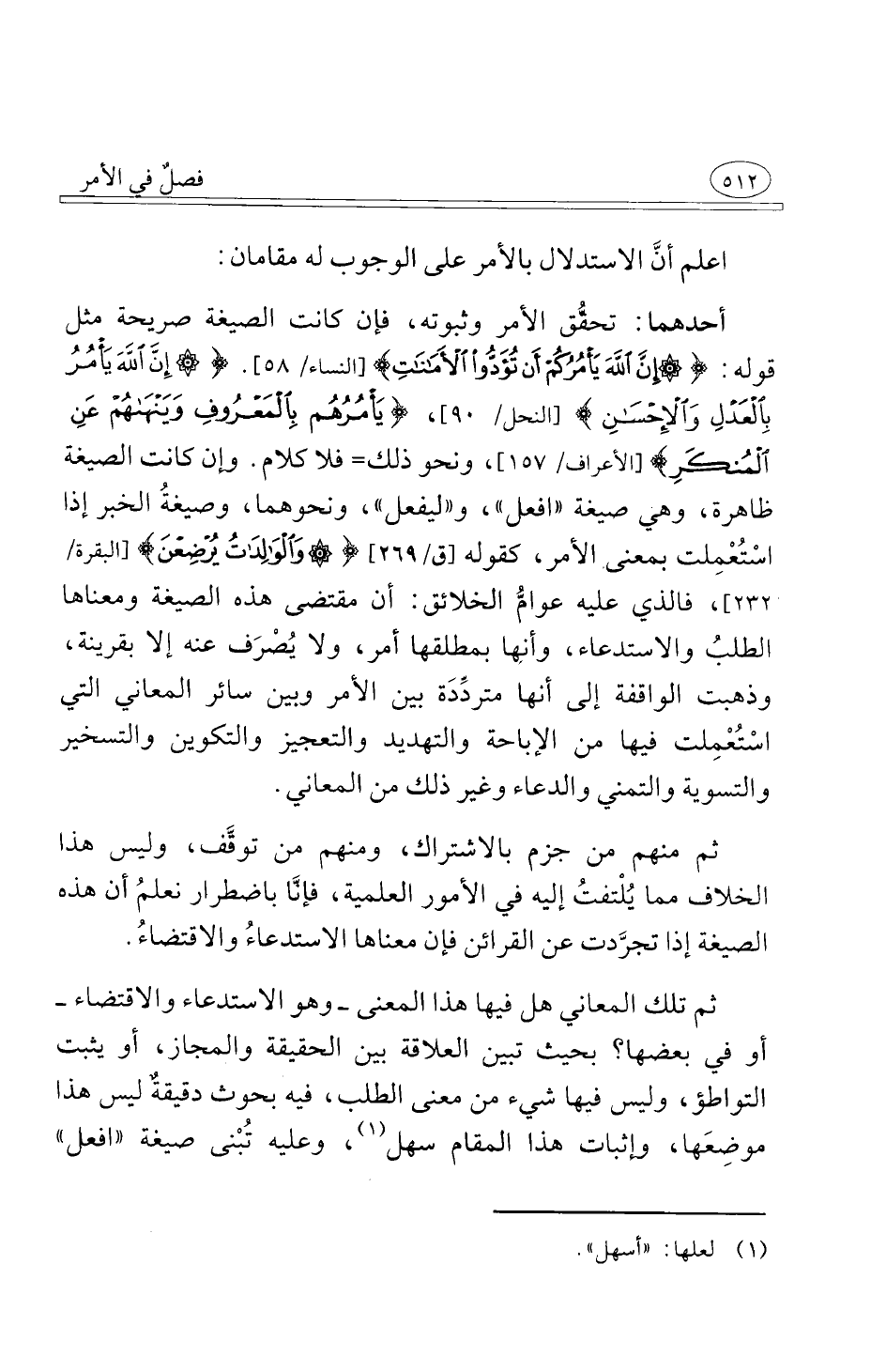 أحدهما تحقُّق الأمر وثبوته فإن كانت الصيغة صريحة مثل قوله إِنَّ اللَّهَ يَأْمُرُكُمْ أَنْ تُؤَدُّوا الْأَمَانَاتِ [النساء 58] إِنَّ اللَّهَ يَأْمُرُ بِالْعَدْلِ وَالْإِحْسَانِ [النحل 90] يَأْمُرُهُمْ بِالْمَعْرُوفِ وَيَنْهَاهُمْ عَنِ الْمُنْكَرِ [الأعراف 157] ونحو ذلك فلا كلام وإن كانت الصيغة ظاهرة وهي صيغة افعل و ليفعل ونحوهما وصيغةُ الخبر إذا اسْتُعِْملت بمعنى الأمر كقوله وَالْوَالِدَاتُ يُرْضِعْنَ [البقرة 233] فالذي عليه عوامُّ الخلائق أن مقتضى هذه الصيغة ومعناها الطلبُ والاستدعاء وأنِها بمطلقها أمر ولا يُصْرَف عنه إلا بقرينة وذهبت الواقفة إلى أنها مترِّدَة بين الأمر وبين سائر المعاني التي اسْتُعْمِلت فيها من الإباحة والتهديد والتعجيز والتكوين والتسخير والتسوية والتمني والدعاء وغير ذلك من المعاني