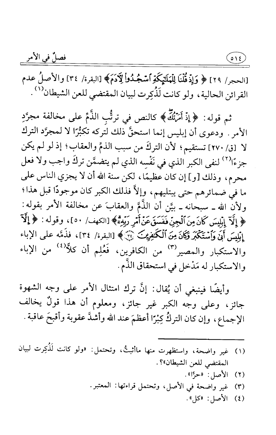 وأيضًا فينبغي أن يُقال إنَّ ترك امتثال الأمر على وجه الشهوة جائز وعلى وجه الكبر غير جائز ومعلوم أن هذا قولٌ يخالف الإجماع وإن كان التركُ كِبْرًا أعظمَ عند الله وأشدَّ عقوبة وأقبحَ عاقبة