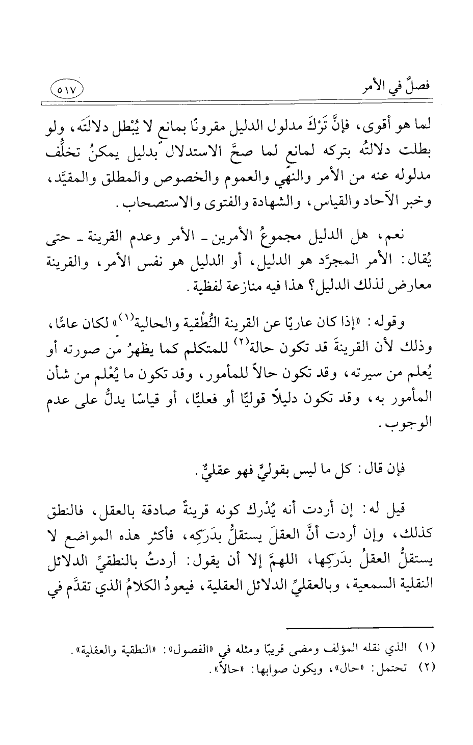 وقوله إذا كان عاريًا عن القرينة النُّطْقية والحالية لكان عامًّا وذلك لأن القرينةَ قد تكون حالة للمتكلم كما يظهرُ من صورته أو يُعلم من سيرته وقد تكون حالاً للمأمور وقد تكون ما يُعْلم من شأن المأمور به وقد تكون دليلاً قوليًّا أو فعليًّا أو قياسًا يدلُّ على عدم الوجوب