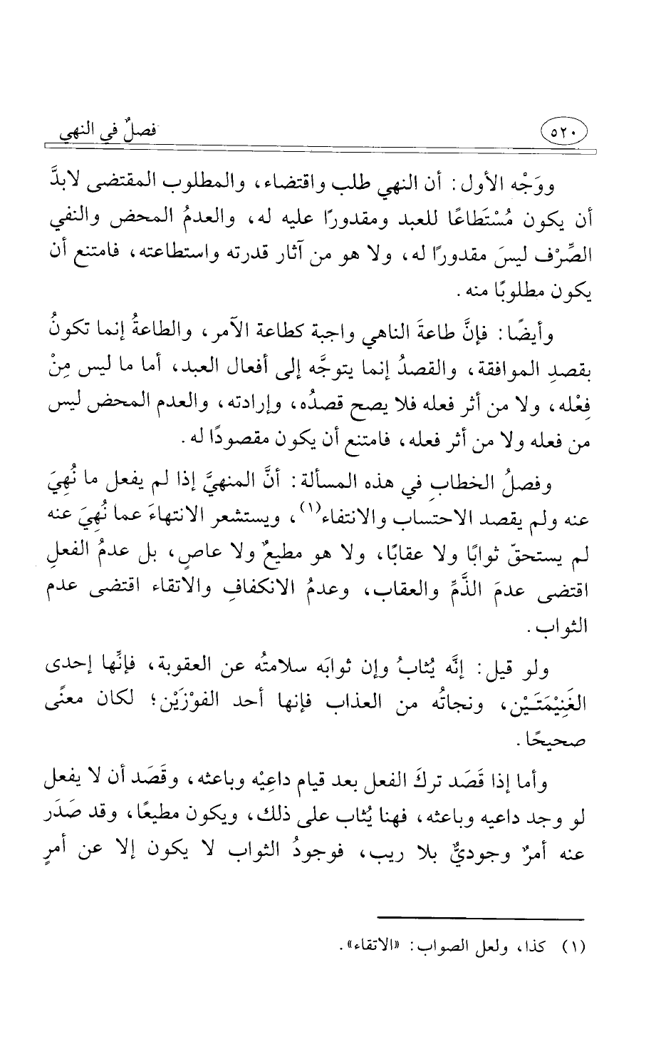 وفصلُ الخطابِ في هذه المسألة أنَّ المنهيَّ إذا لم يفعل ما نُهِيَ عنه ولم يقصد الاحتساب والانتفاء ويستشعر الانتهاءَ عما نُهِيَ عنه لم يستحقّ ثوابًا ولا عقابًا ولا هو مطيعٌ ولا عاصٍ بل عدمُ الفعلِ اقتضى عدمَ الذَّمِّ والعقاب وعدمُ الانكفافِ والاتقاء اقتضى عدم الثواب