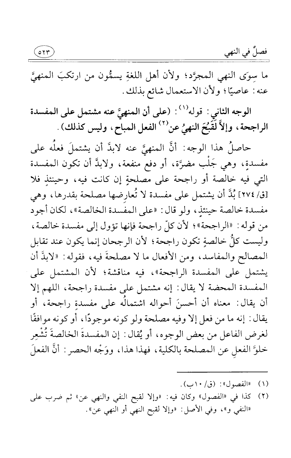 حاصلُ هذا الوجه أنَّ المنهيَّ عنه لابدَّ أن يشتملَ فعلُه على مفسدةٍ وهي جَلْب مضرَّة أو دفع منفعة ولابدَّ أن تكون المفسدة التي فيه خالصة أو راجحة على مصلحةٍ إن كانت فيه وحينئذٍ فلا بُدَّ أن يشتمل على مفسدة لا تُعارِضها مصلحة بقدرها وهي مفسدة خالصة حينئذٍ ولو قال على المفسدة الخالصة لكان أجود من قوله الراجحة لأن كلّ راجحة فإنها تؤول إلى مفسدة خالصة وليست كلُّ خالصةٍ تكون راجحة لأن الرجحان إنما يكون عند تقابل المصالح والمفاسد ومن الأفعال ما لا مصلحةَ فيه فقوله لابدَّ أن يشتمل على المفسدة الراجحة فيه مناقشة لأن المشتمل على المفسدة المحضة لا يقال إنه مشتمل على مفسدة راجحة اللهم إلا أن يقال معناه أن أحسنَ أحواله اشتمالُه على مفسدةٍ راجحة أو يقال إنه ما من فعل إلا وفيه مصلحة ولو كونه موجودًا أو كونه موافقًا لغرض الفاعل من بعض الوجوه أو يُقال إن المفسدةَ الخالصةَ تُشْعِر خلوَّ الفعلِ عن المصلحة بالكلية فهذا هذا ووَجْه الحصر أنَّ الفعلَ
