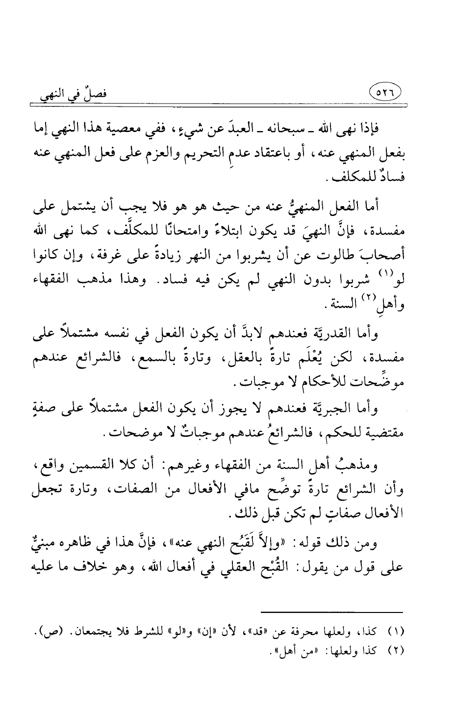 ومن ذلك قوله وإلاَّ لَقَبُح النهي عنه فإنَّ هذا في ظاهره مبنيٌّ على قول من يقول القُبْح العقلي في أفعال الله وهو خلاف ما عليه
