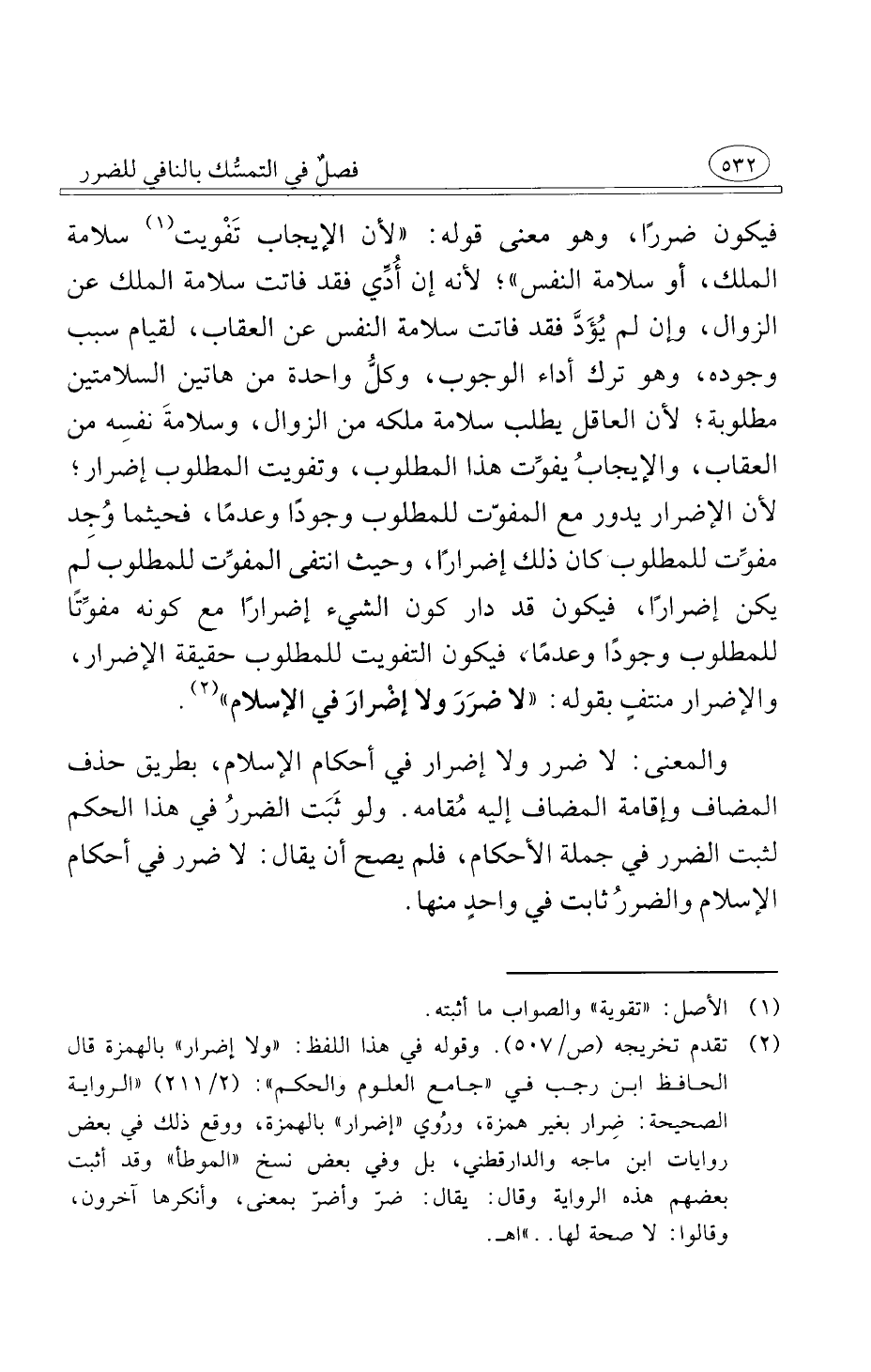 والمعنى لا ضرر ولا إضرار في أحكام الإسلام بطريق حذف المضاف وإقامة المضاف إليه مُقامه ولو ثَبَت الضررُ في هذا الحكم لثبت الضرر في جملة الأحكام فلم يصح أن يقال لا ضرر في أحكام الإسلام والضررُ ثابت في واحدٍ منها