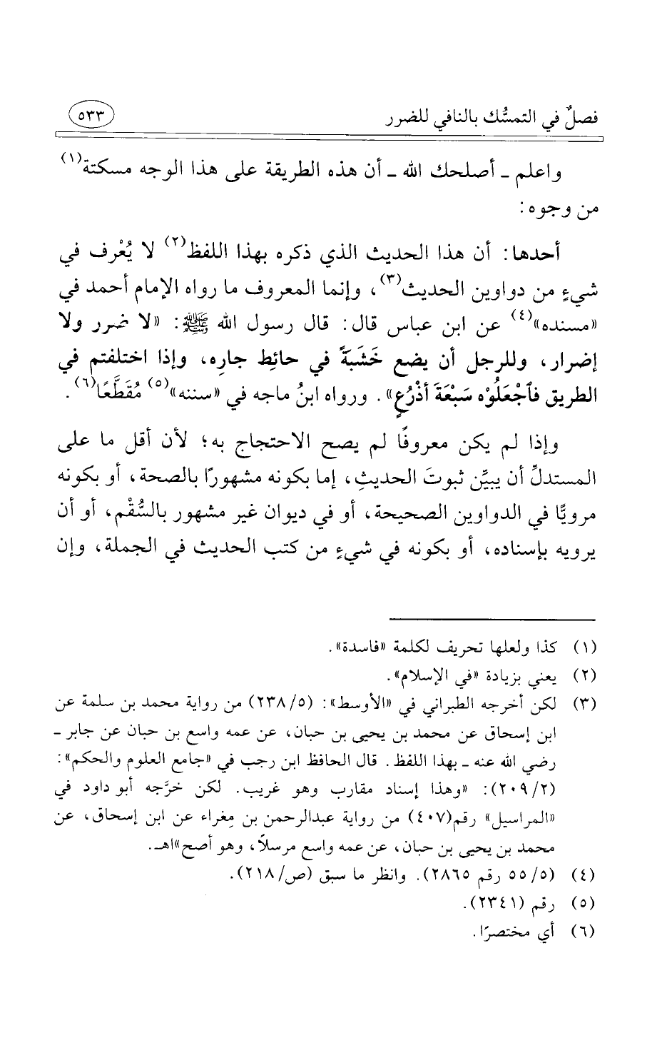 أحدها أن هذا الحديث الذي ذكره بهذا اللفظ لا يُعْرف في شيءٍ من دواوين الحديث وإنما المعروف ما رواه الإمام أحمد في مسنده عن ابن عباس قال قال رسول الله صلى الله عليه وسلم لا ضرر ولا إضرار وللرجل أن يضع خَشَبَةً في حائِط جارِه وإذا اختلفتم في الطريق فاجْعَلُوْه سَبْعَة أذْرُعٍ ورواه ابنُ ماجه في سننه مُقَطَّعًا