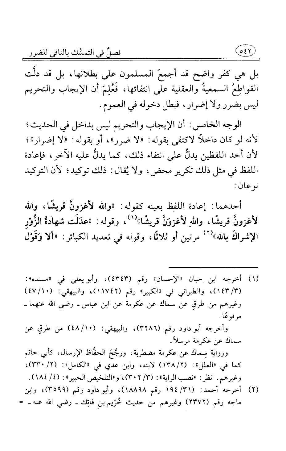 الوجه الخامس أن الإيجاب والتحريم ليس بداخل في الحديث لأنه لو كان داخلاً لاكتفي بقوله لا ضرر أو بقوله لا إضرار لأن أحد اللفظين يدلُّ على انتفاء ذلك كما يدلُّ عليه الآخر فإعادة اللفظ في مثل ذلك تكرير محض ولا يُقال ذلك توكيد لأن التوكيد نوعان