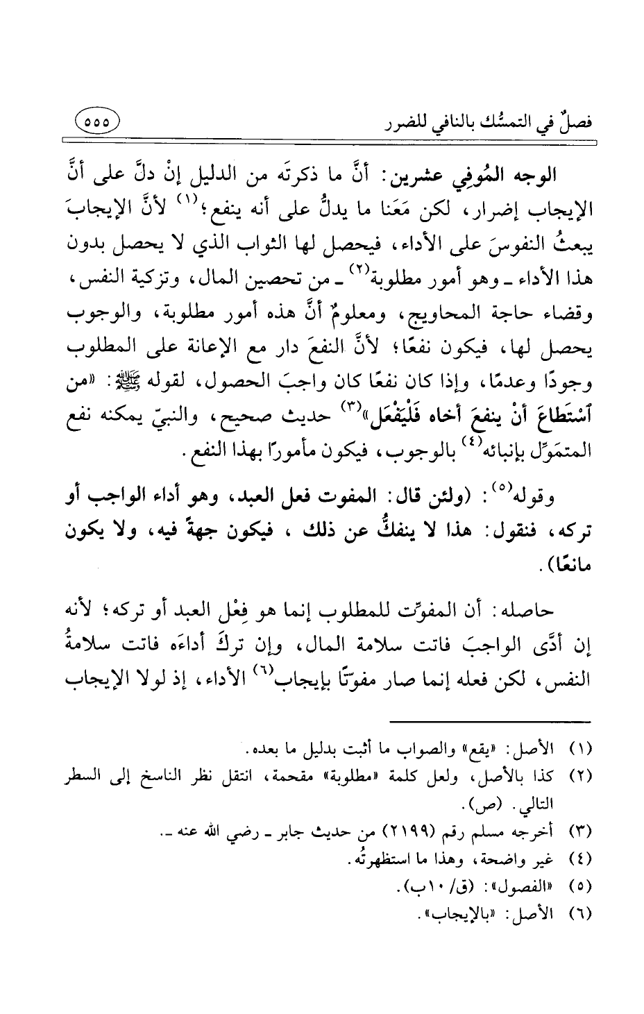 الوجه المُوفِي عشرين أنَّ ما ذكرتَه من الدليل إنْ دلَّ على أنَّ الإيجاب إضرار لكن مَعَنا ما يدلُّ على أنه ينفع لأنَّ الإيجابَ يبعثُ النفوسَ على الأداء فيحصل لها الثواب الذي لا يحصل بدون هذا الأداء وهو أمور مطلوبة من تحصين المال وتزكية النفس وقضاء حاجة المحاويج ومعلومٌ أنَّ هذه أمور مطلوبة والوجوب يحصل لها فيكون نفعًا لأنَّ النفعَ دار مع الإعانة على المطلوب وجودًا وعدمًا وإذا كان نفعًا كان واجبَ الحصول لقوله صلى الله عليه وسلم من اسْتَطاعَ أنْ ينفعَ أخاه فَلْيَفْعَل حديث صحيح والنبيّ يمكنه نفع المتمَوِّل بإنبائه بالوجوب فيكون مأمورًا بهذا النفع