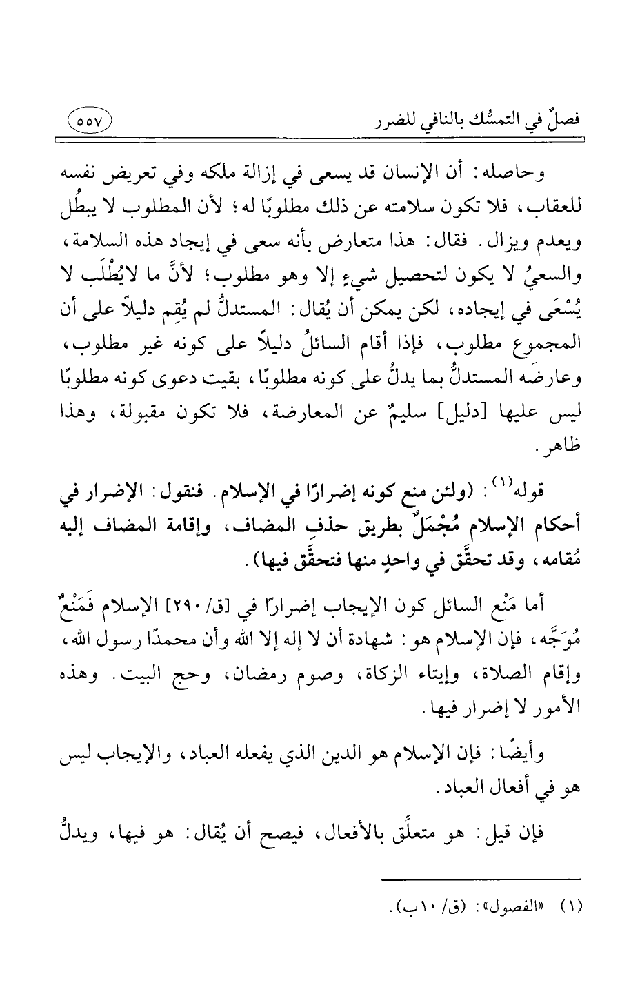 قوله ولئن منع كونه إضرارًا في الإسلام فنقول الإضرار في أحكام الإسلام مُجْمَلٌ بطريق حذفِ المضاف وإقامة المضاف إليه مُقامه وقد تحقَّق في واحدٍ منها فتحقَّق فيها
