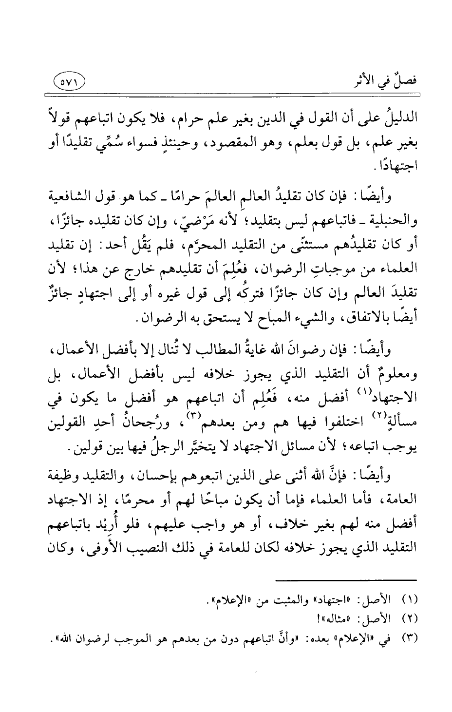 وأيضًا فإن رضوانَ الله غايةُ المطالب لا تُنال إلا بأفضل الأعمال ومعلومٌ أن التقليد الذي يجوز خلافه ليس بأفضل الأعمال بل الاجتهاد أفضل منه فَعُلِم أن اتباعهم هو أفضل ما يكون في مسألةٍ اختلفوا فيها هم ومن بعدهم ورُجحانُ أحدِ القولين يوجب اتباعه لأن مسائل الاجتهاد لا يتخيَّر الرجلُ فيها بين قولين