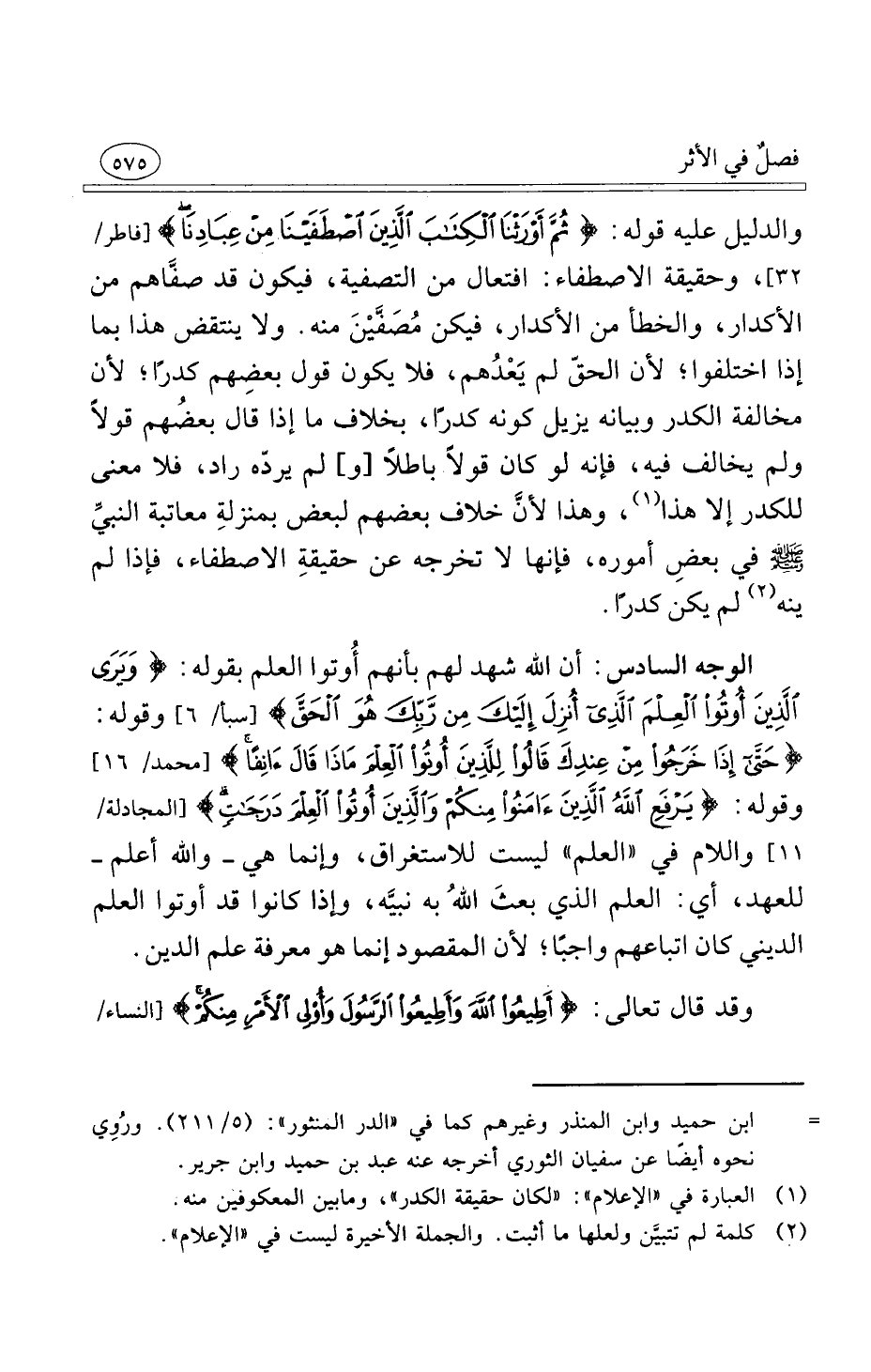 الوجه السادس أن الله شهد لهم بأنهم أُوتوا العلم بقوله وَيَرَى الَّذِينَ أُوتُوا الْعِلْمَ الَّذِي أُنْزِلَ إِلَيْكَ مِنْ رَبِّكَ هُوَ الْحَقَّ [سبأ 6] وقوله حَتَّى إِذَا خَرَجُوا مِنْ عِنْدِكَ قَالُوا لِلَّذِينَ أُوتُوا الْعِلْمَ مَاذَا قَالَ آنِفًا [محمد 16] وقوله يَرْفَعِ اللَّهُ الَّذِينَ آمَنُوا مِنْكُمْ وَالَّذِينَ أُوتُوا الْعِلْمَ دَرَجَاتٍ [المجادلة 11] واللام في العلم ليست للاستغراق وإنما هي والله أعلم للعهد أي العلم الذي بعثَ اللهُ به نبيَّه وإذا كانوا قد أوتوا العلم الديني كان اتباعهم واجبًا لأن المقصود إنما هو معرفة علم الدين