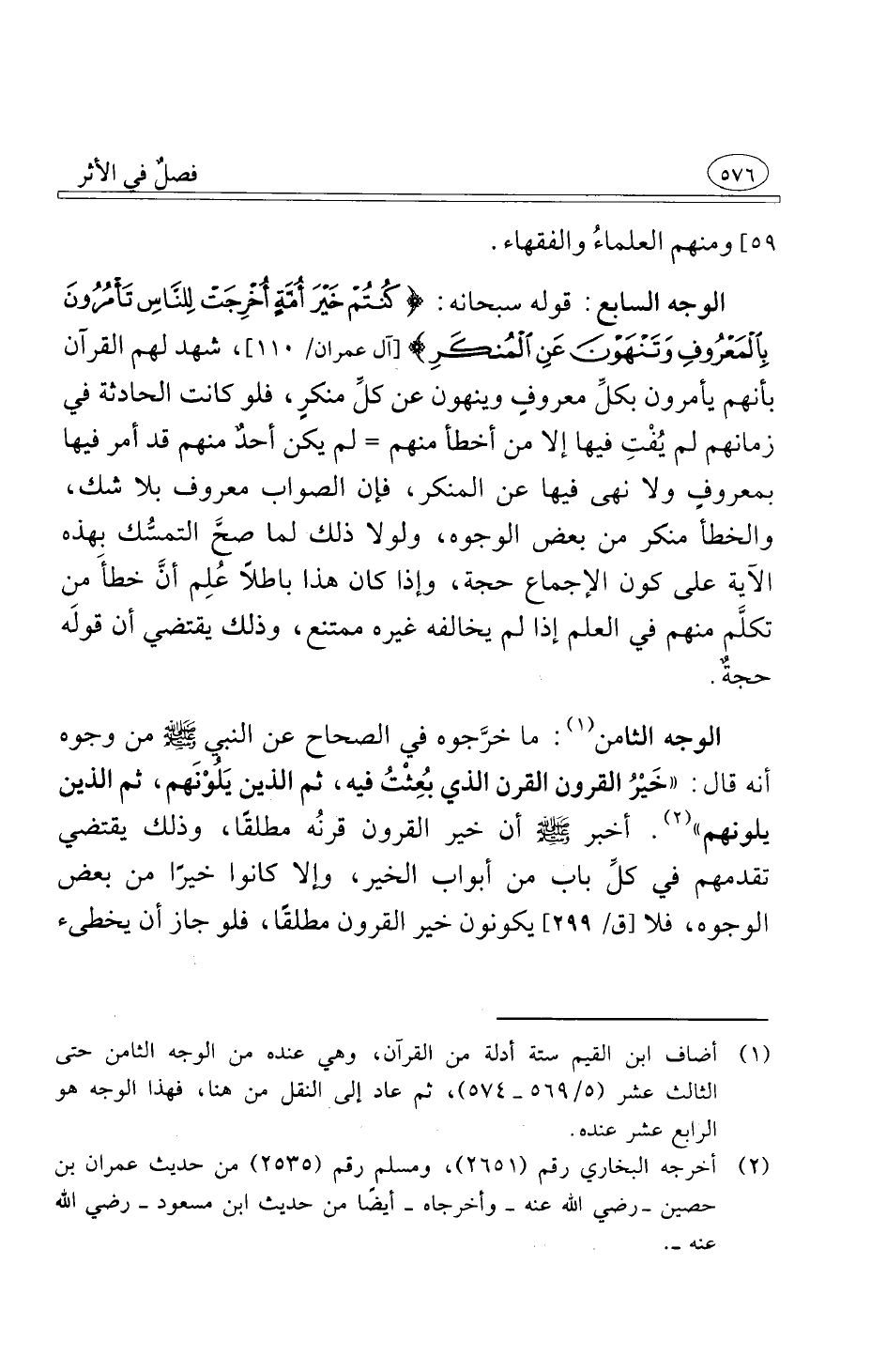 الوجه السابع قوله سبحانه كُنْتُمْ خَيْرَ أُمَّةٍ أُخْرِجَتْ لِلنَّاسِ تَأْمُرُونَ بِالْمَعْرُوفِ وَتَنْهَوْنَ عَنِ الْمُنْكَرِ [آل عمران 110] شهد لهم القرآن بأنهم يأمرون بكلِّ معروفٍ وينهون عن كلِّ منكرٍ فلو كانت الحادثة في زمانهم لم يُفْتِ فيها إلا من أخطأ منهم لم يكن أحدٌ منهم قد أمر فيها بمعروفٍ ولا نهى فيها عن المنكر فإن الصواب معروف بلا شك والخطأ منكر من بعض الوجوه ولولا ذلك لما صحَّ التمسُّك بهذه الآية على كون الإجماع حجة وإذا كان هذا باطلاً عُلِم أنَّ خطأَ من تكلَّم منهم في العلم إذا لم يخالفه غيره ممتنع وذلك يقتضي أن قولَه حجةٌ
