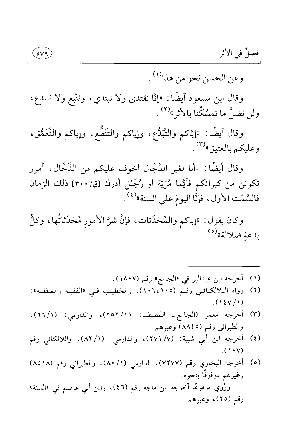 وقال ابن مسعود أيضًا إنَّا نقتدي ولا نبتدي ونتَّبع ولا نبتدع ولن نضلَّ ما تمسَّكْنا بالأثر