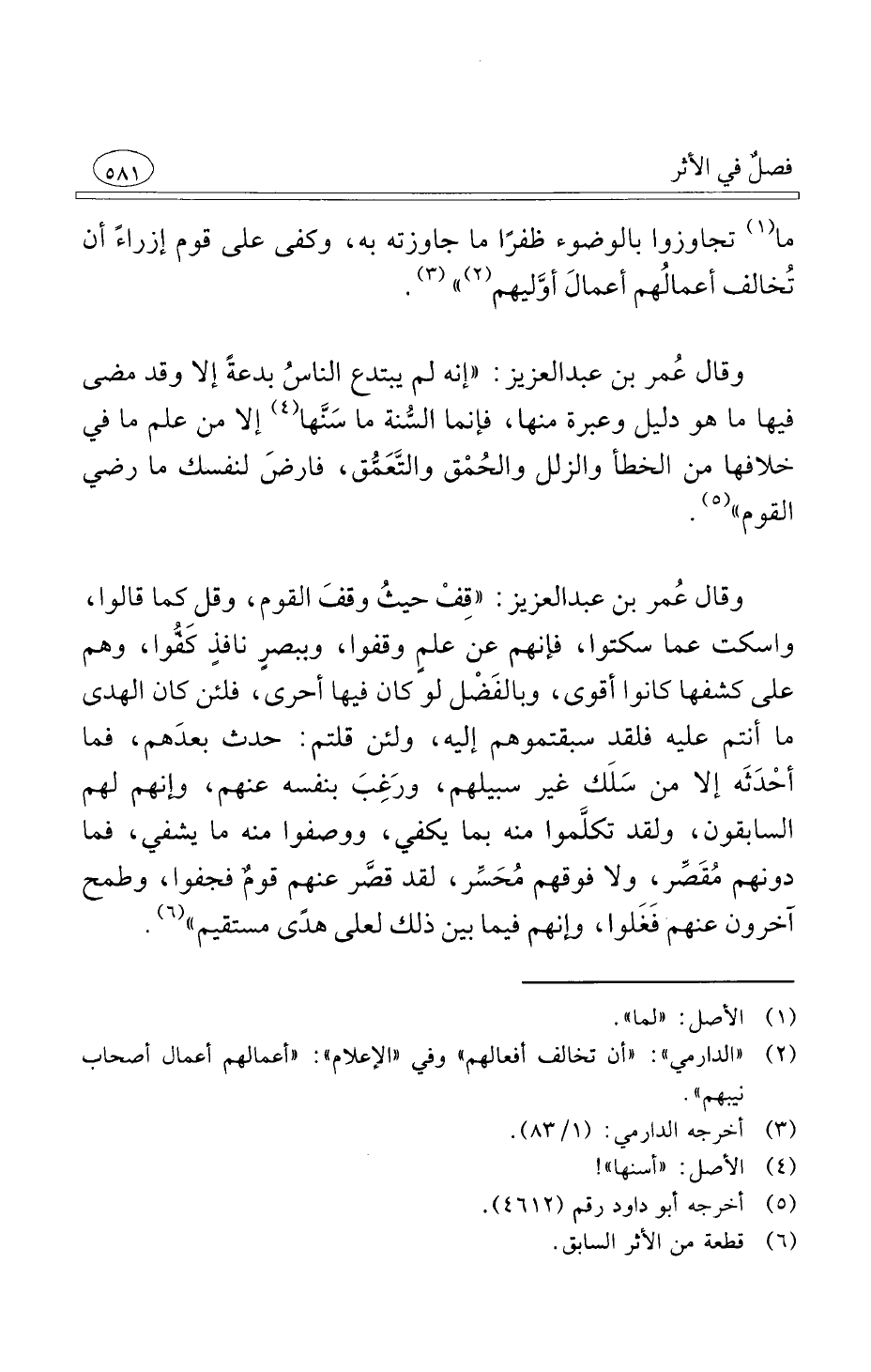 وقال عُمر بن عبد العزيز قِفْ حيثُ وقفَ القوم وقل كما قالوا واسكت عما سكتوا فإنهم عن علمٍ وقفوا وببصرٍ نافذٍ كَفُّوا وهم على كشفها كانوا أقوى وبالفَضْل لو كان فيها أحرى فلئن كان الهدى ما أنتم عليه فلقد سبقتموهم إليه ولئن قلتم حدث بعدَهم فما أحْدَثَه إلا من سَلَك غير سبيلهم ورَغِبَ بنفسه عنهم وإنهم لهم السابقون ولقد تكلَّموا منه بما يكفي ووصفوا منه ما يشفي فما دونهم مُقَصِّر ولا فوقهم مُحَسِّر لقد قصَّر عنهم قومٌ فجفوا وطمح آخرون عنهم فَغَلوا وإنهم فيما بين ذلك لعلى هدًى مستقيم