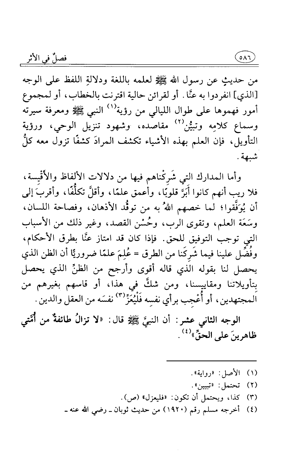 الوجه الثاني عشر أن النبيَّ صلى الله عليه وسلم قال لا تزالُ طائفةٌ من أُمَّتي ظاهرينَ على الحقِّ