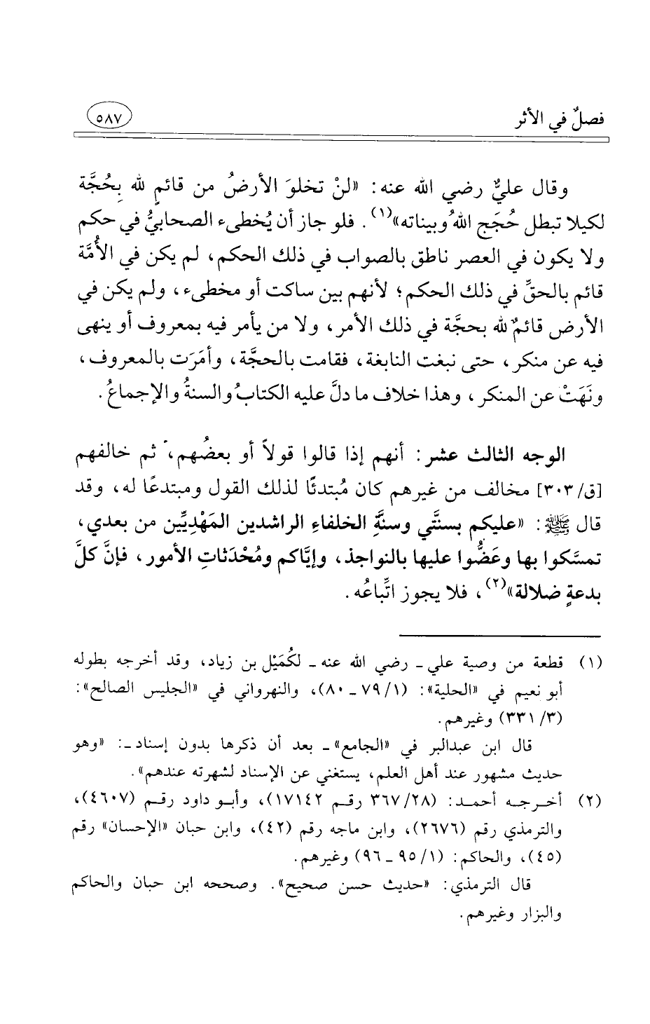 الوجه الثالث عشر أنهم إذا قالوا قولاً أو بعضُهم ثم خالفهم مخالف من غيرهم كان مُبتدئًا لذلك القول ومبتدعًا له وقد قال صلى الله عليه وسلم عليكم بسنًّتي وسنَّةِ الخلفاءِ الراشدين المَهْدِيِّين من بعدي تمسَّكوا بها وعَضُّوا عليها بالنواجذ وإيَّاكم ومُحْدَثاتِ الأمور فإنَّ كلَّ بدعةٍ ضلالة فلا يجوز اتِّباعُه