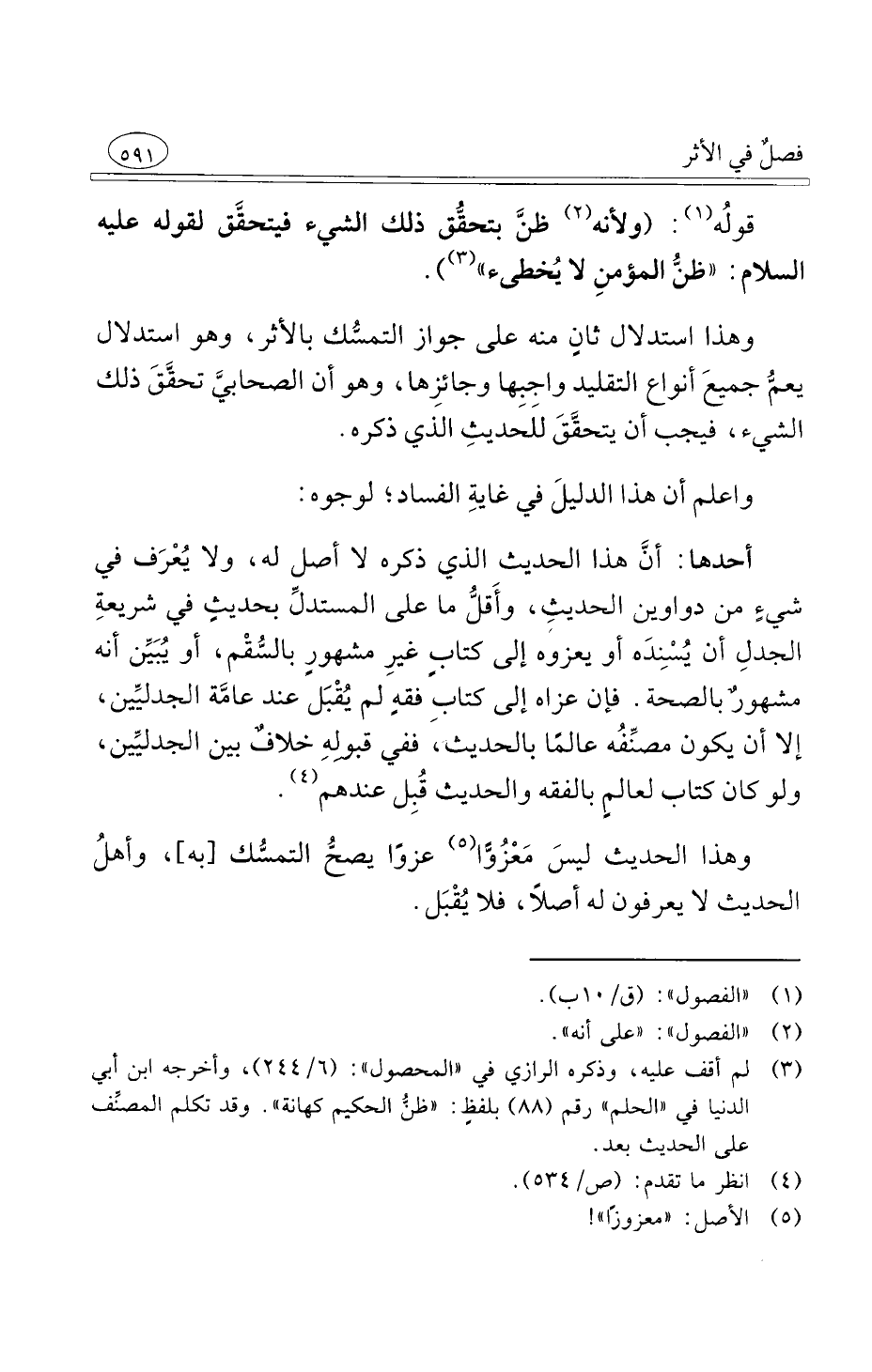قولُه ولأنه ظنَّ بتحقُّق ذلك الشيء فيتحقَّق لقوله عليه السلام ظنُّ المؤمنِ لا يُخطىء