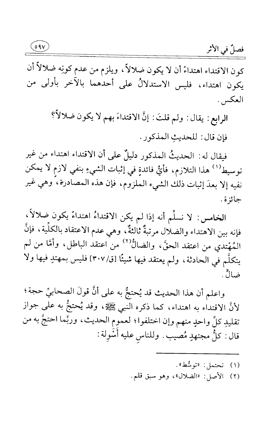 الخامس لا نسلِّم أنه إذا لم يكن الاقتداءُ اهتداءً يكون ضلالاً فإنه بين الاهتداء والضلال مرتبةٌ ثالثةٌ وهي عدم الاعتقاد بالكلِّية فإنَّ المُهْتدي من اعتقد الحقَّ والضالُّ من اعتقد الباطل وأمَّا من لم يتكلَّم في الحادثة ولم يعتقد فيها شيئًا فليس بمهتدٍ فيها ولا ضالٍّ